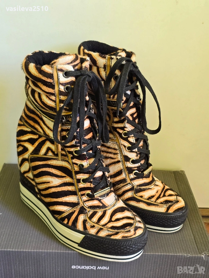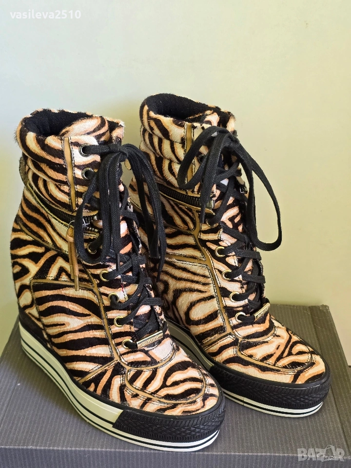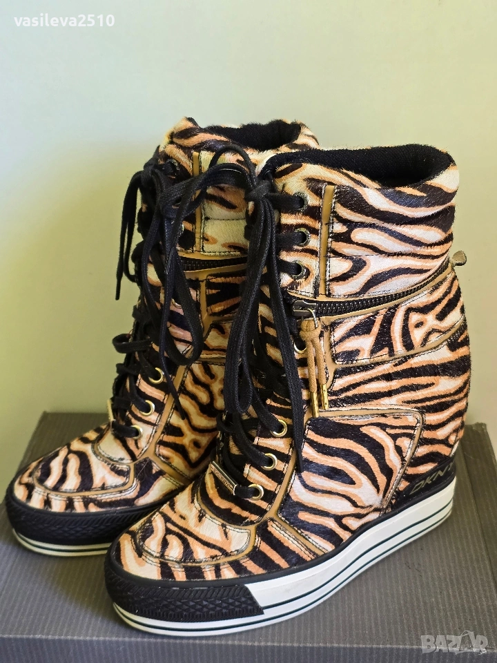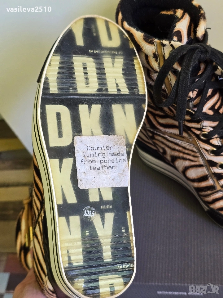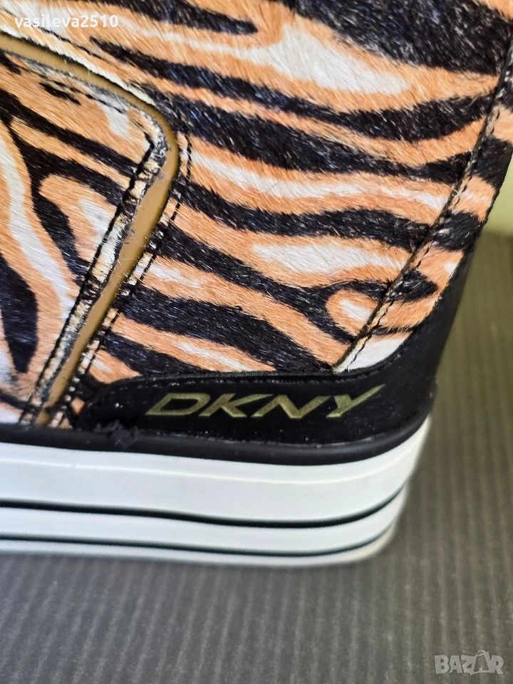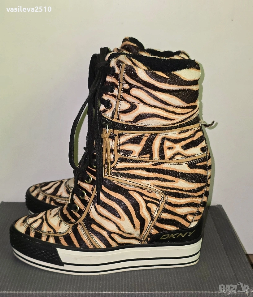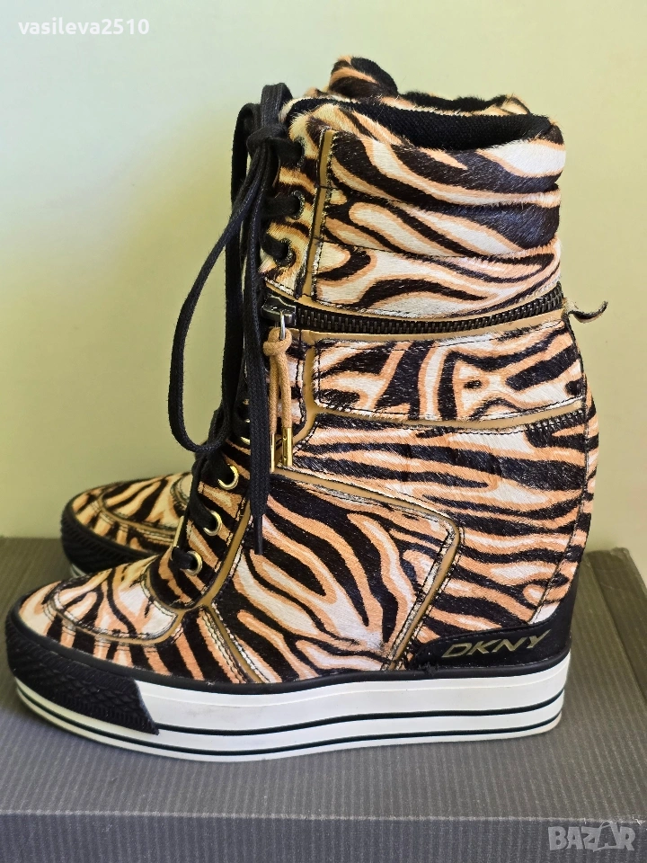 DKNY страхотни лимитирани дамски кецове на платформа от естествена кожа с естествен косъм, размер 38.5, стелката в сантиметри е 24.5, горната част е с цип може да се маха и да стават по-къси, обувани са веднъж в безупречно състояние.