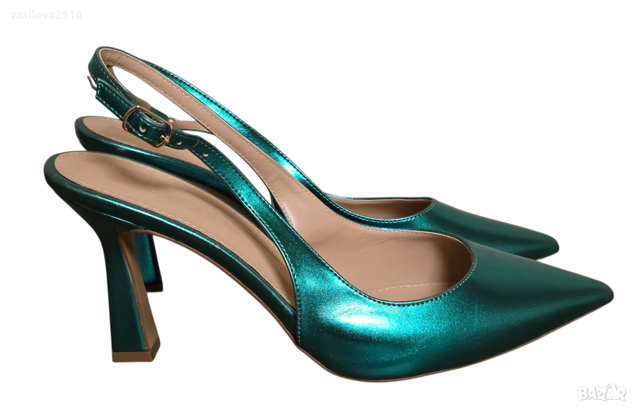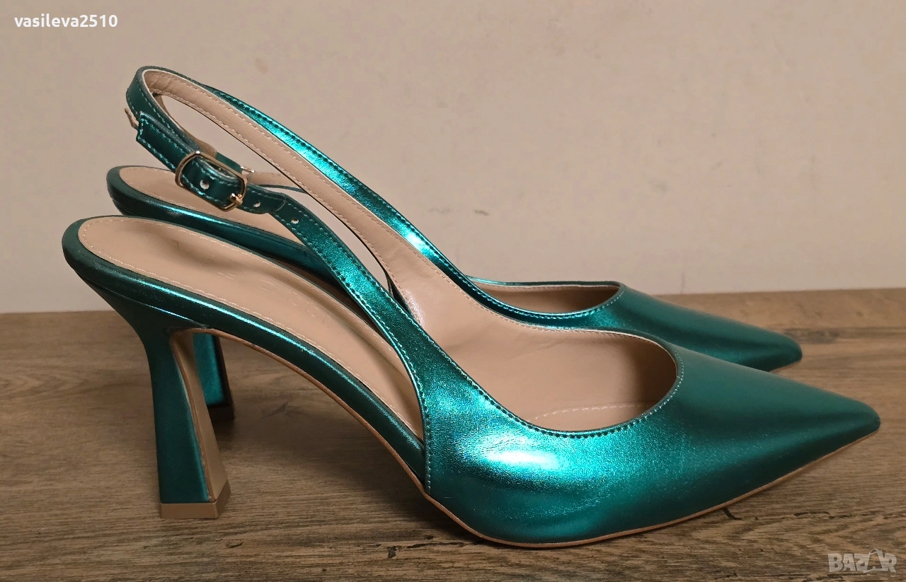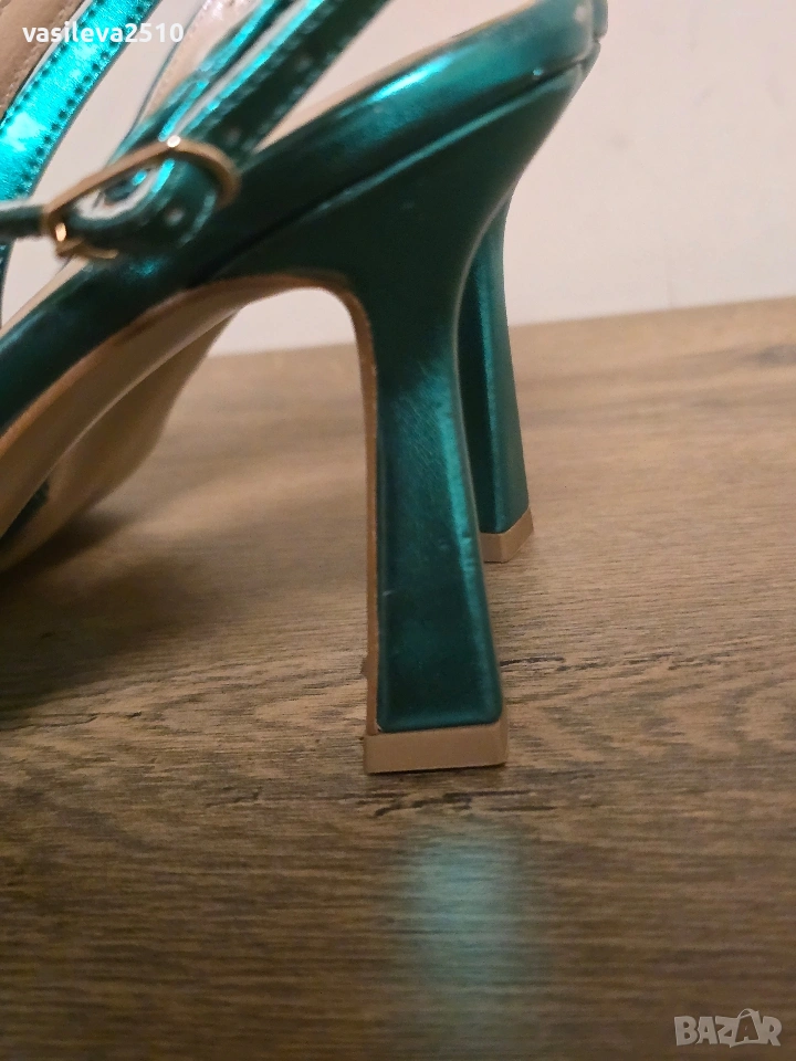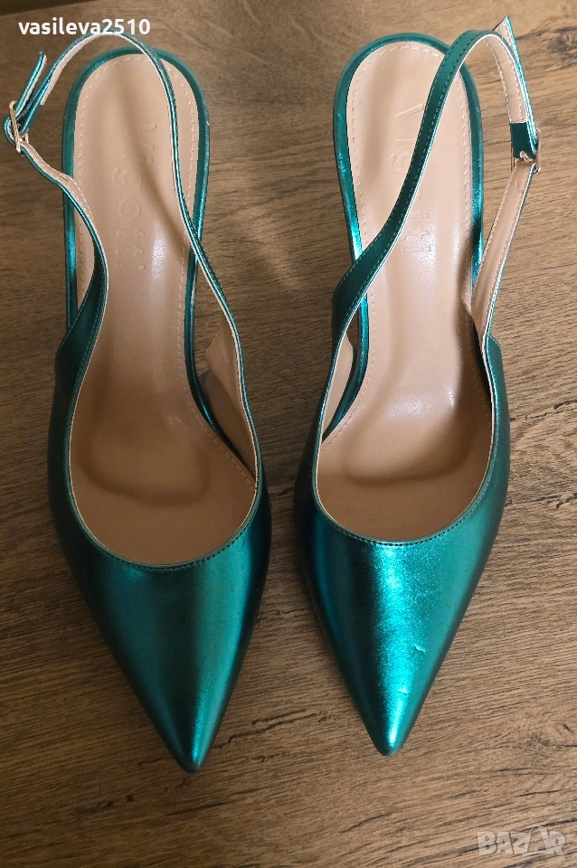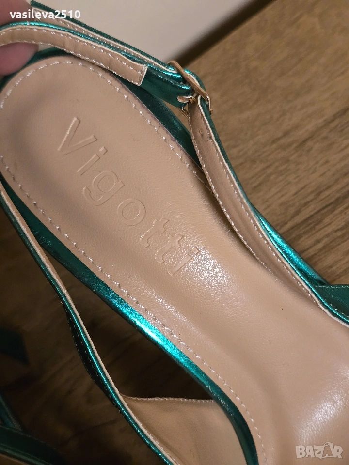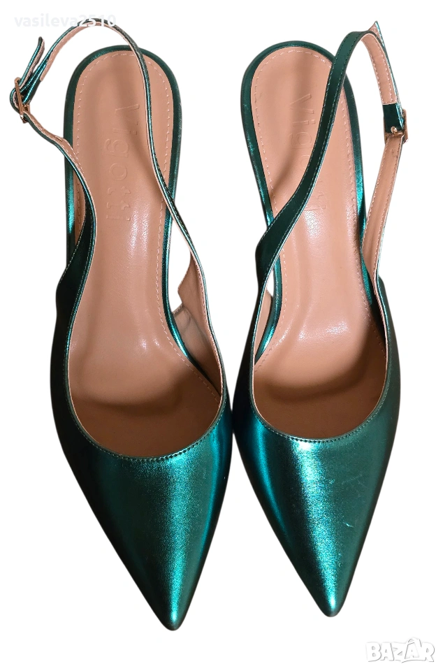 Vigotti оригинални дамски обувки с интересен ток от естествена кожа, цвета е зелен металик, обувани са веднъж в безупречно състояние абсолютно като нови.