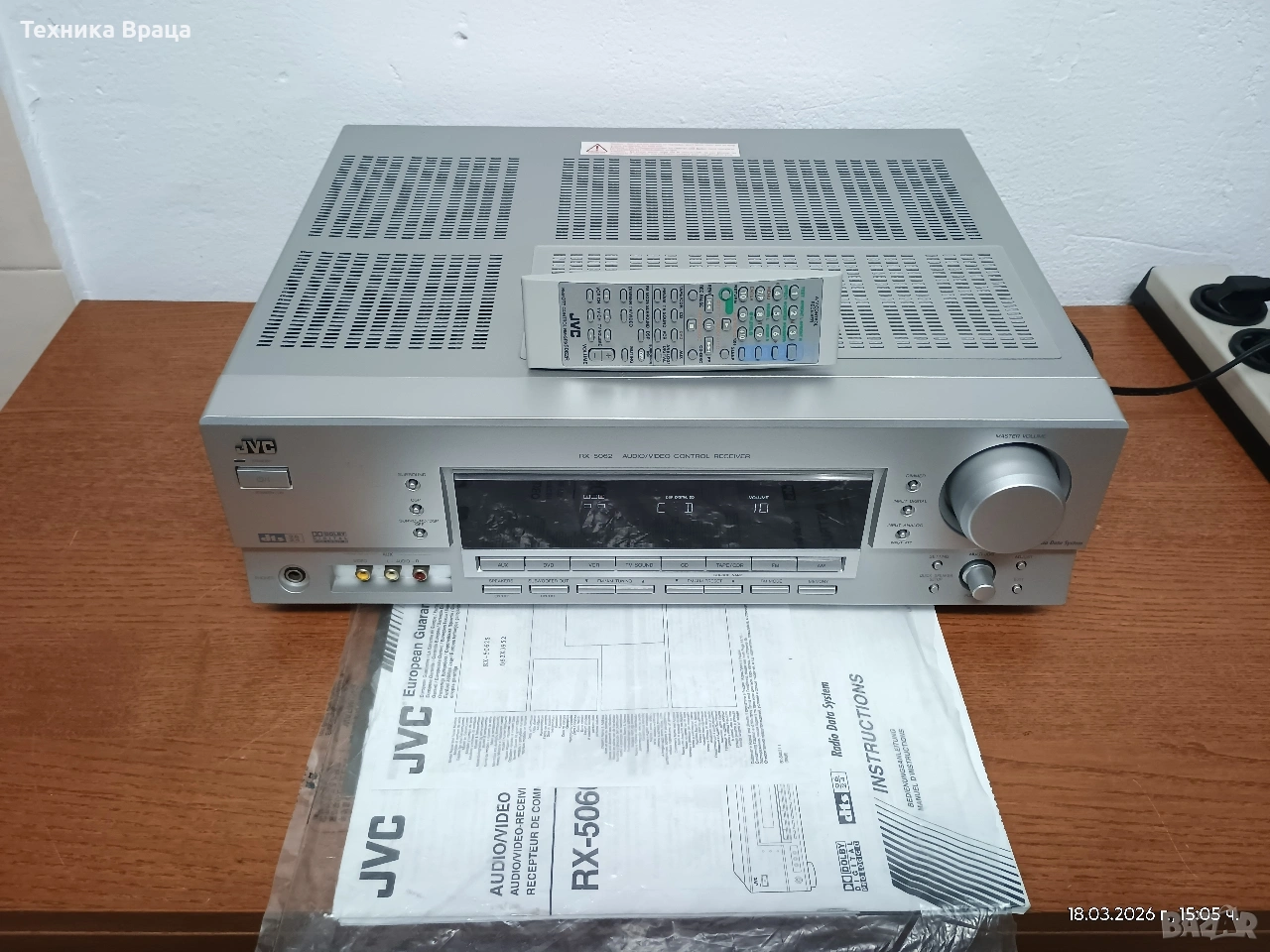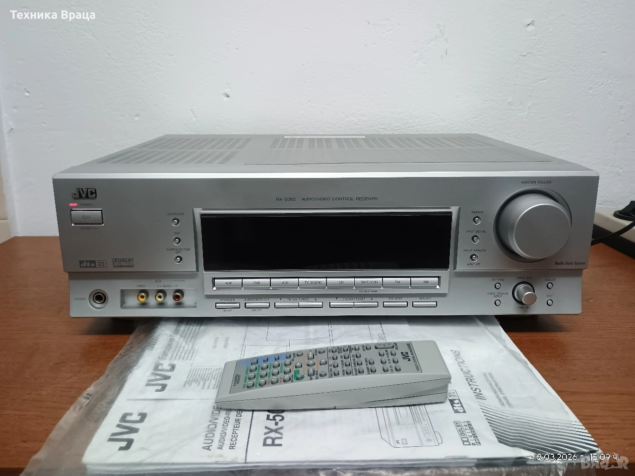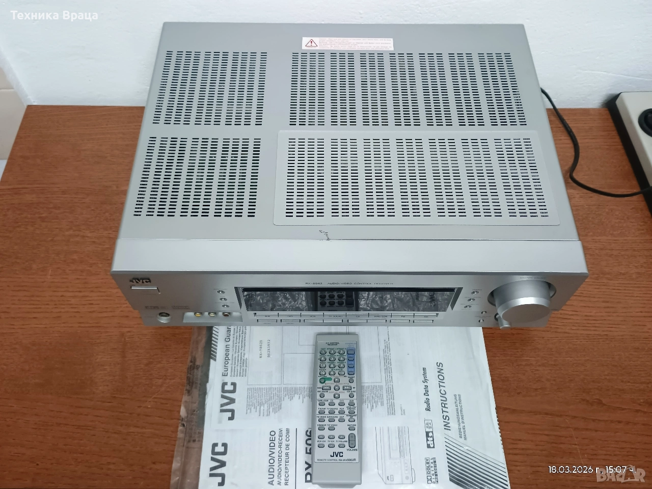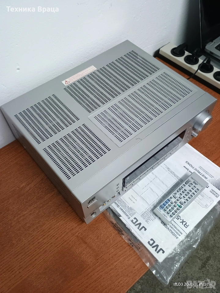 5 канален ресивър (усилвател) JVC RX-5062 S в състояние доближаващо се до ново! Само една драскотина на горния капак! Безупречна работа, много добър звук и много режими и настройки на звука. Оригинално дистанционно и книжки от производителя.