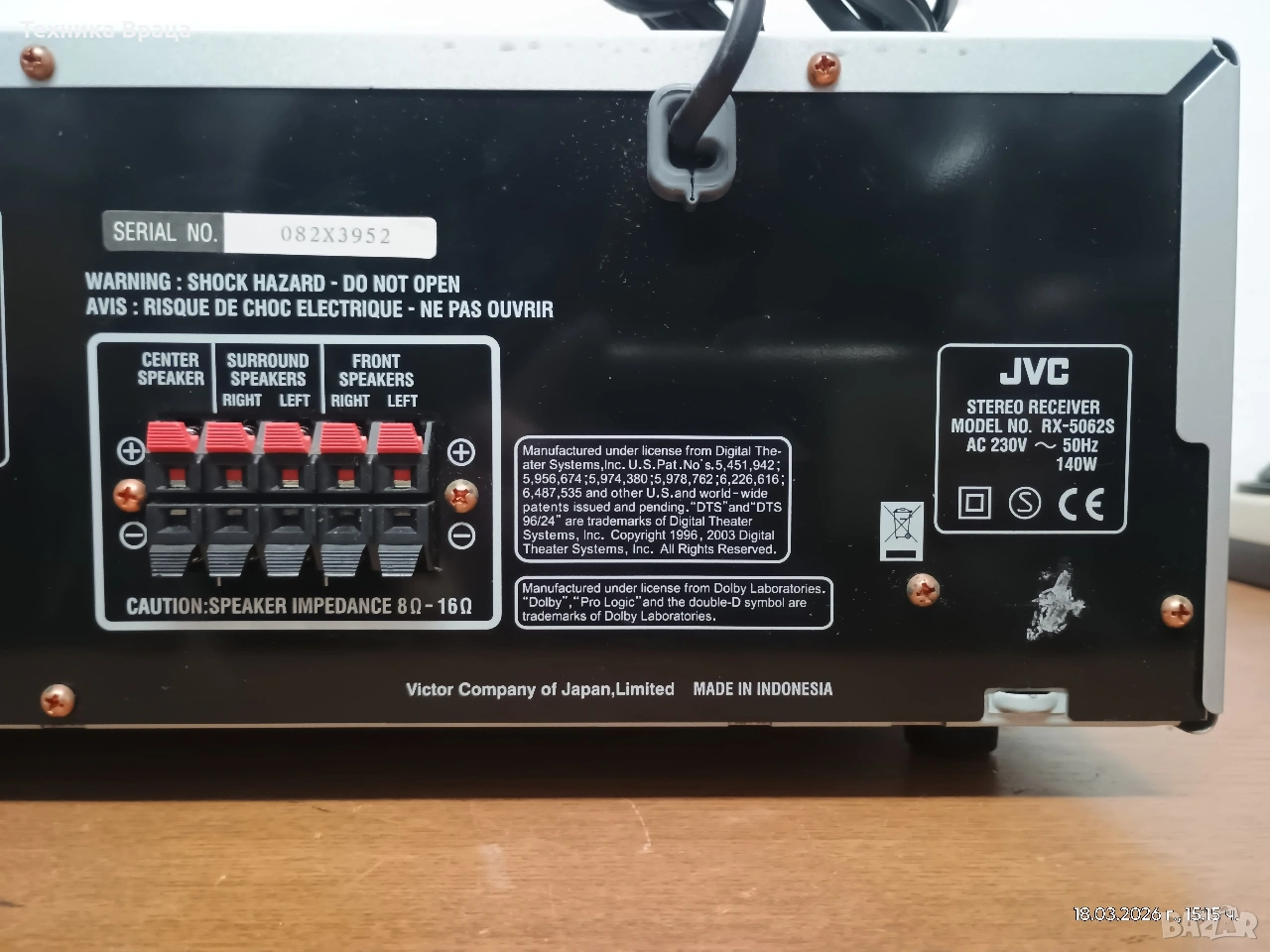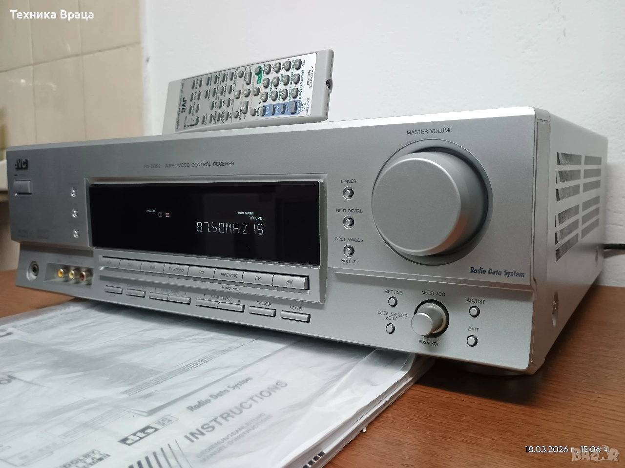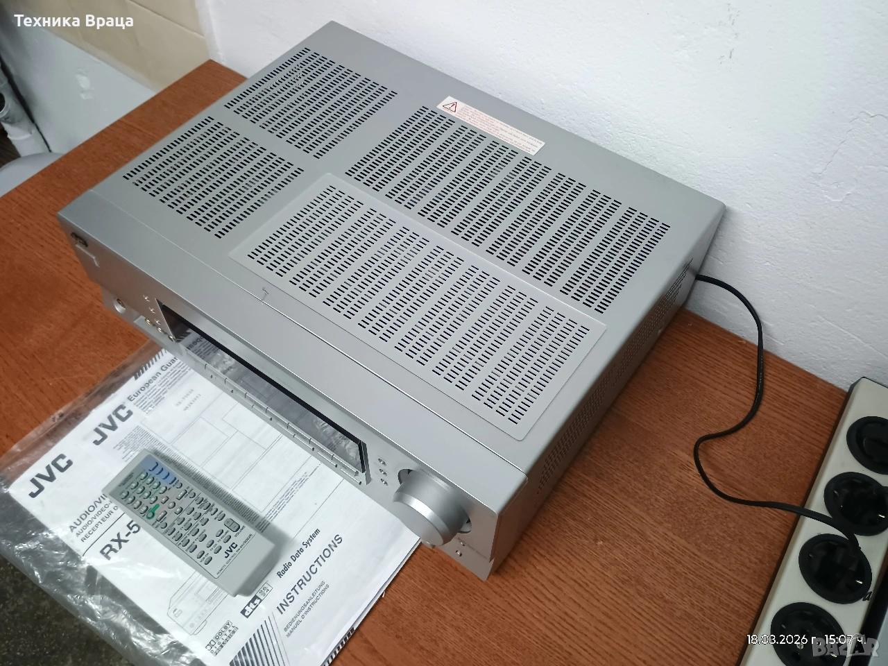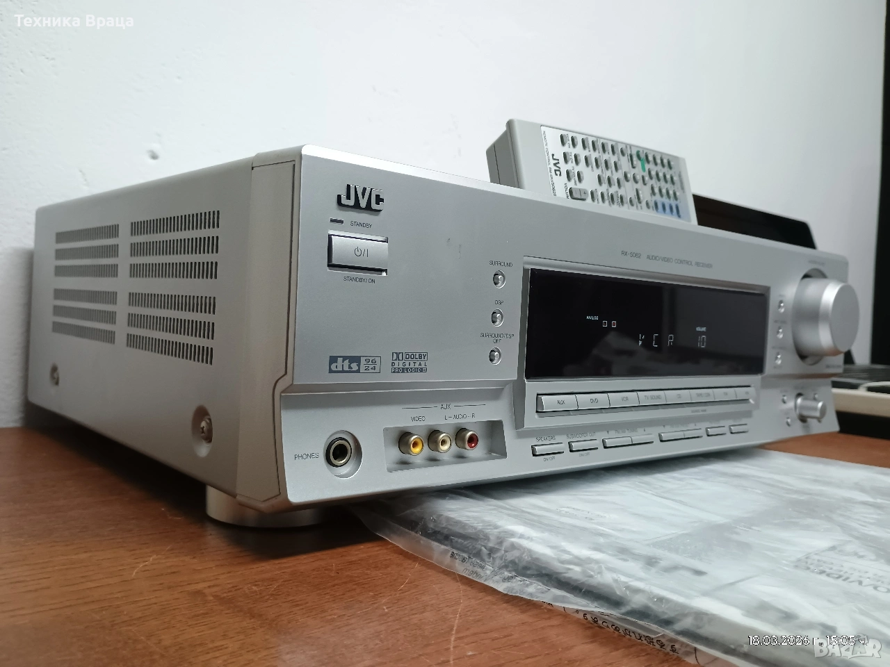 5 канален ресивър (усилвател) JVC RX-5062 S в състояние доближаващо се до ново! Само една драскотина на горния капак! Безупречна работа, много добър звук и много режими и настройки на звука. Оригинално дистанционно и книжки от производителя.