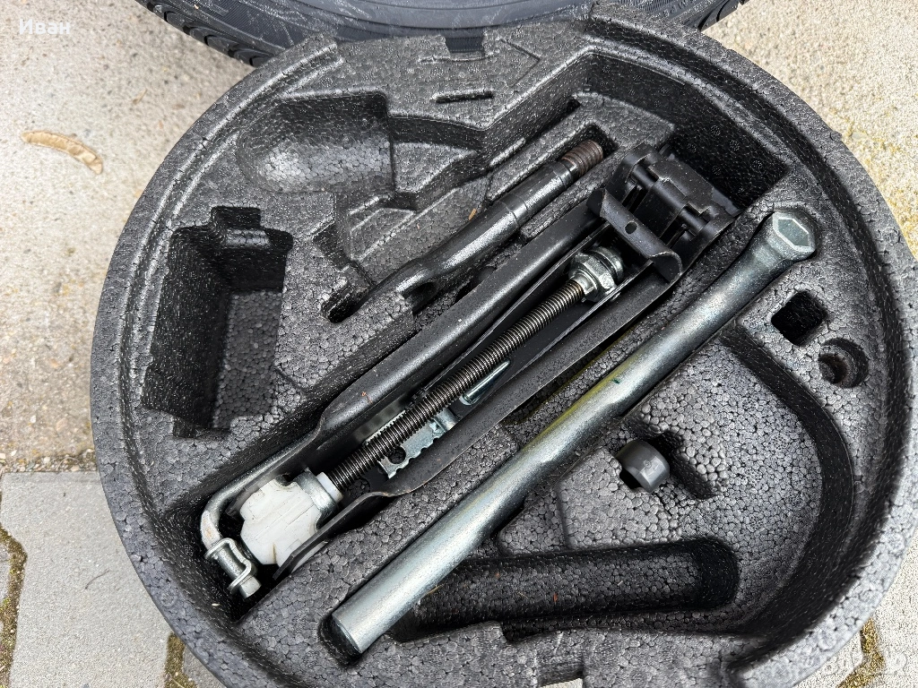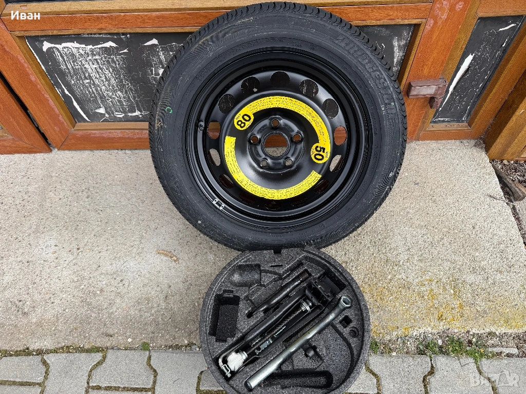 Комплектът е напълно оригинален “VW AG - VAG”, ЧИСТО НОВИ АРТИКУЛИ!! Включва чисто нови гума с джанта 16 цола (нормален размер, не патерица), крик, ключ за болтове, кука и други принадлежности!