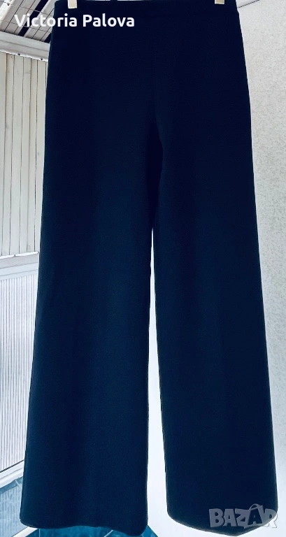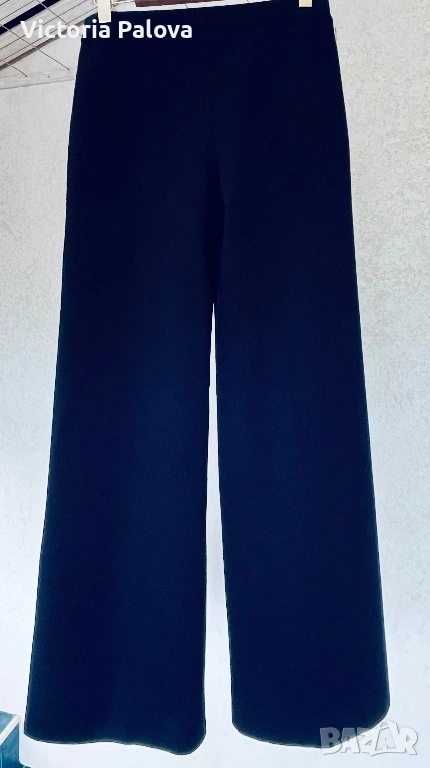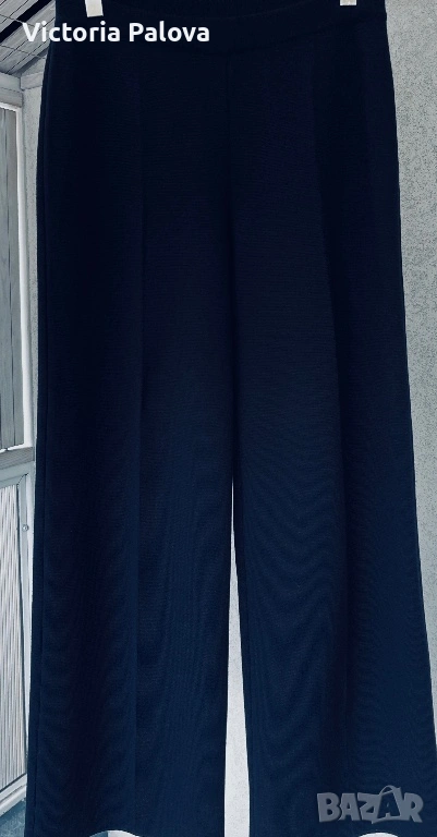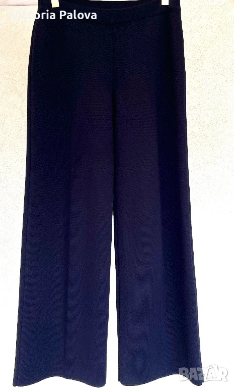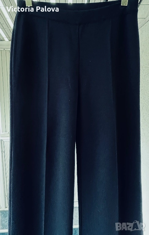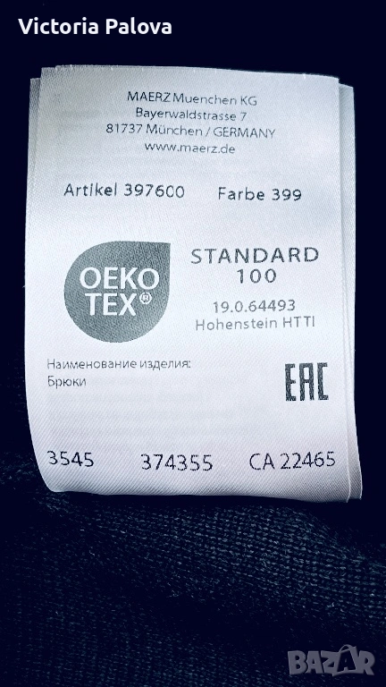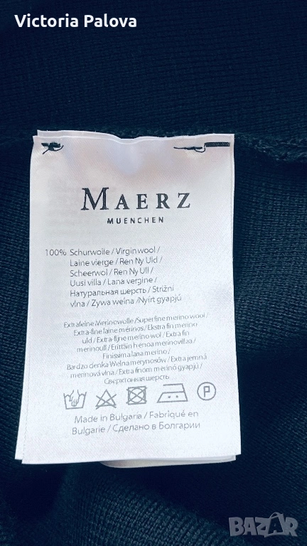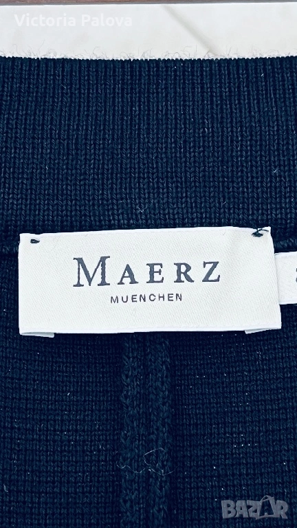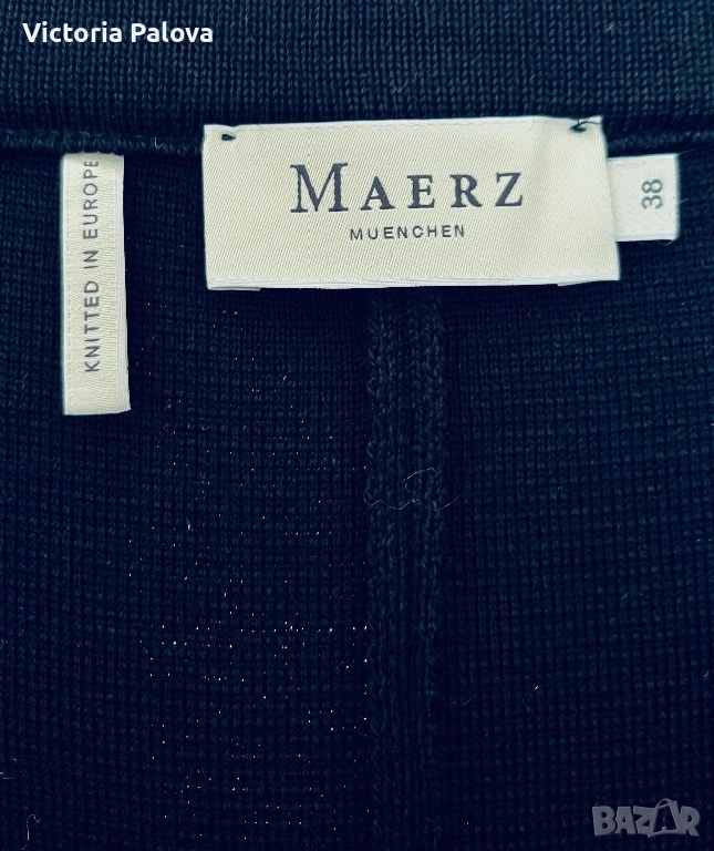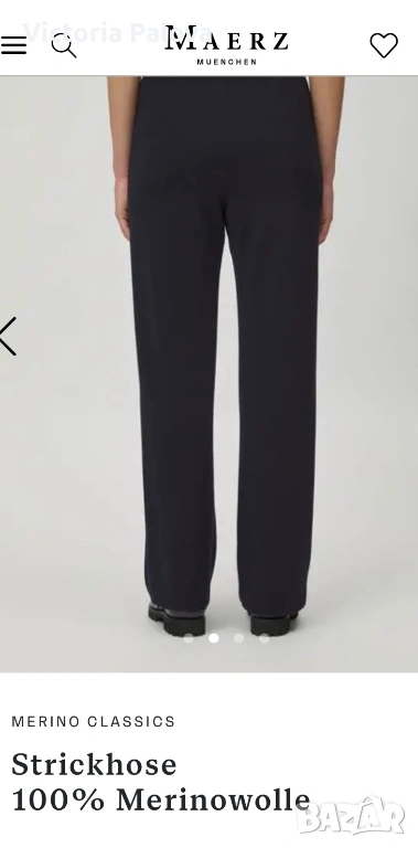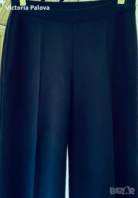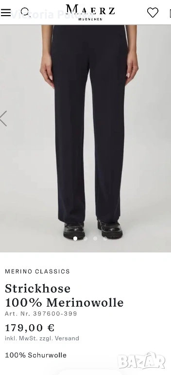 Висококачествен дамски плетен панталон от немската марка MAERZ Muenchen, който съчетава истински германски комфорт и изискан стил в едно. Този модел Strickhose от 100% мериносова вълна е в дълбок тъмносин нюанс, който на светлина изглежда почти черен, невероятно елегантен и универсален и се комбинира безупречно с всичко, от пуловер и блейзър до ежедневни блузи. Изработен е от чиста мериносова вълна с италианска прежда, а плътната еластична плетка Milano Rib го прави тежък, мек като кадифе и изключително приятен на допир. Ластикът в колана осигурява супер комфортна талия от 40 см в спокойно състояние, която се разтяга лесно с още 10–12 см, общата дължина е 103 см, вътрешният крачол е 72 см, а широчината на крачола е 31 см горе и 27,5 см долу. Кройката е права с леко разширение надолу, така че панталонът стои идеално на фигурата, без да стяга и без да губи форма. Най-специалното е, че благодарение на самата плетка той създава красиви вертикални Bügelfalten по крачолите, които изглеждат все едно са току-що гладени с ютия. Панталонът е сертифициран с OEKO-TEX STANDARD 100 под номер 19.0.64493 от Hohenstein HTTI и носи EAC маркировка, което гарантира високо качество и пълна липса на вредни вещества. Той е абсолютно нов, с оригинален етикет, никога не е носен – само пробван. Актуалната цена в официалния сайт е 179 €, в някои германски магазини ( OTTO) - 229€.