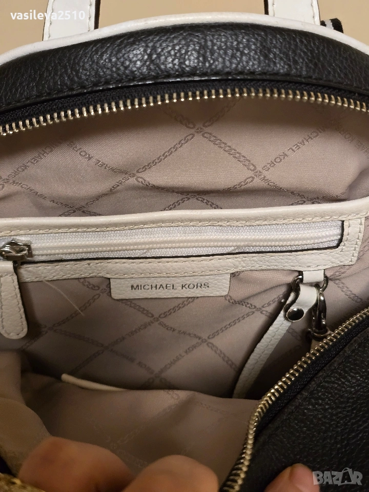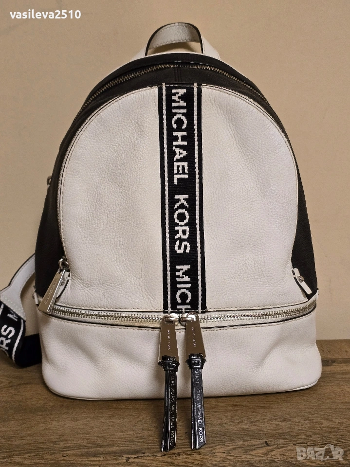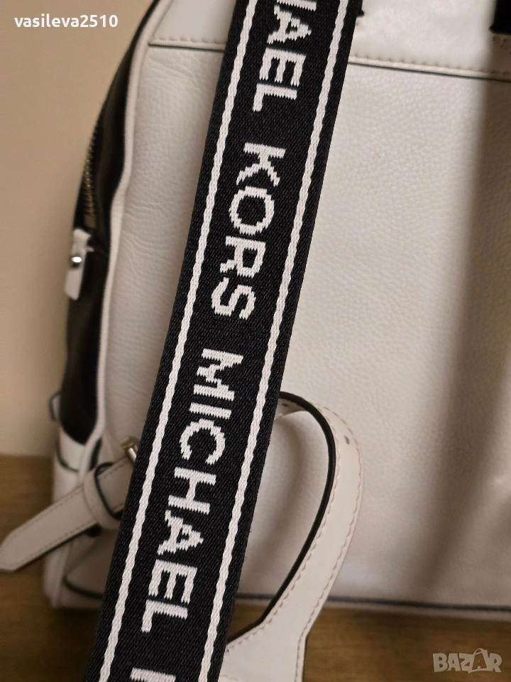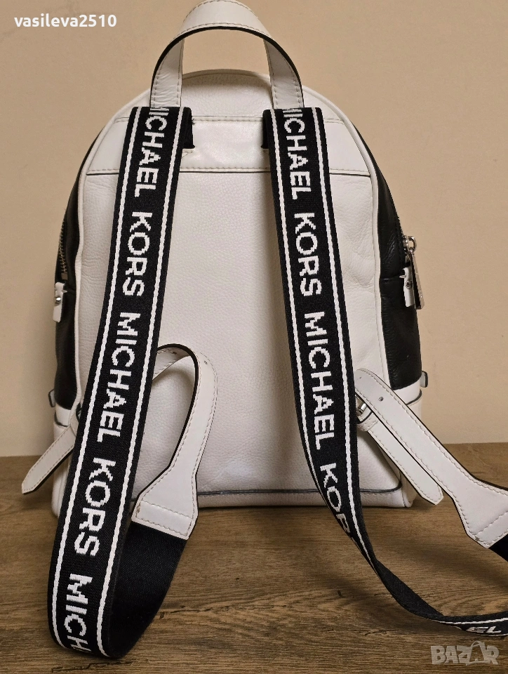 Michael Kors оригинална дамска раница бяло с черно от естествена кожа с две основни отделния с преден и вътрешни джобове, металните елементи са сребристи.