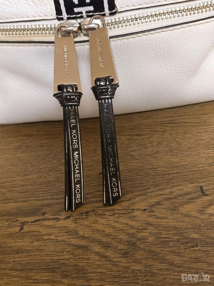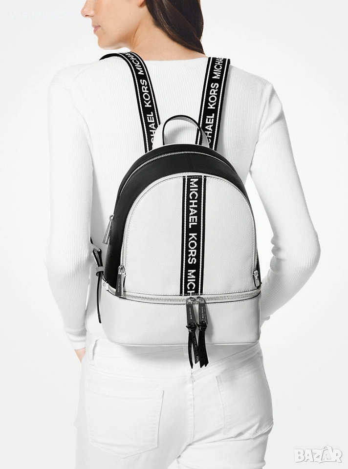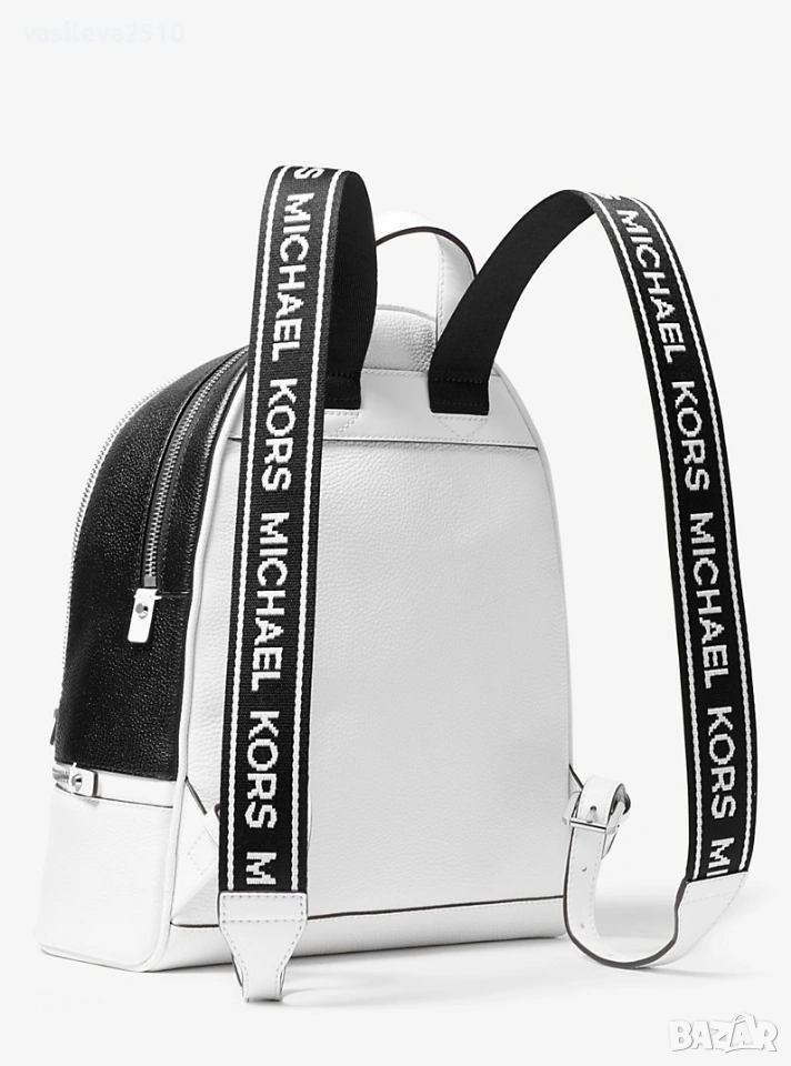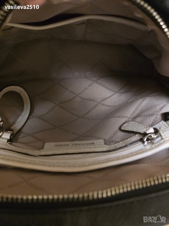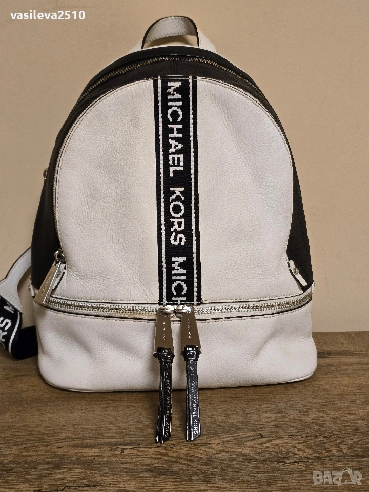 Michael Kors оригинална дамска раница бяло с черно от естествена кожа с две основни отделния с преден и вътрешни джобове, металните елементи са сребристи.