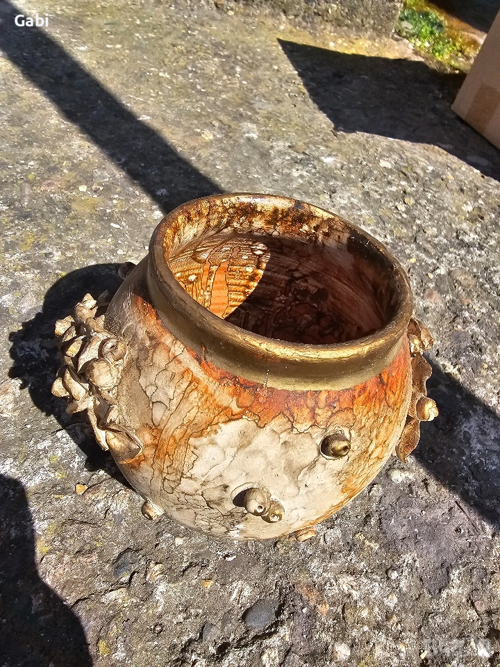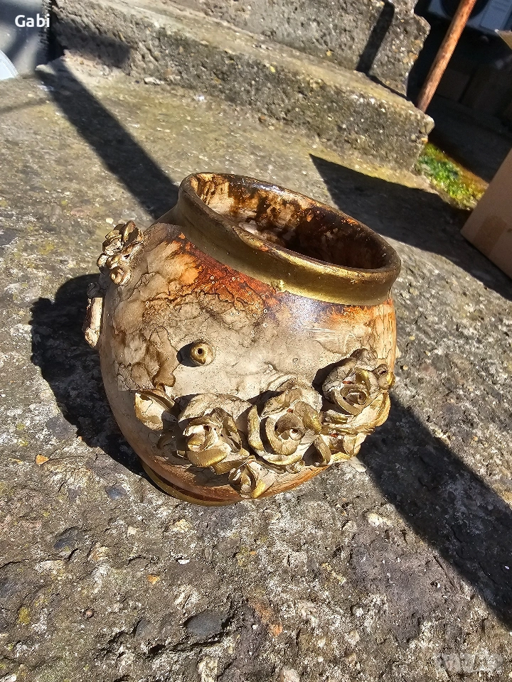Ръчно изработена керамична ваза с височина 15 см, отличаваща се с уникална текстура и богата декорация. Дизайнът залага на контраста между суровата, напукана повърхност (наподобяваща естествен камък или античен пергамент) и деликатните пластични елементи във формата на рози.Гърлото на съда е подчертано от позлатен кант, който придава на предмета антикварен завършек и изисканост.