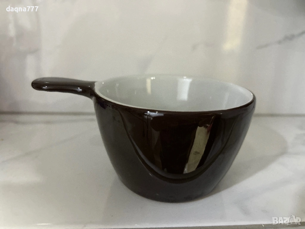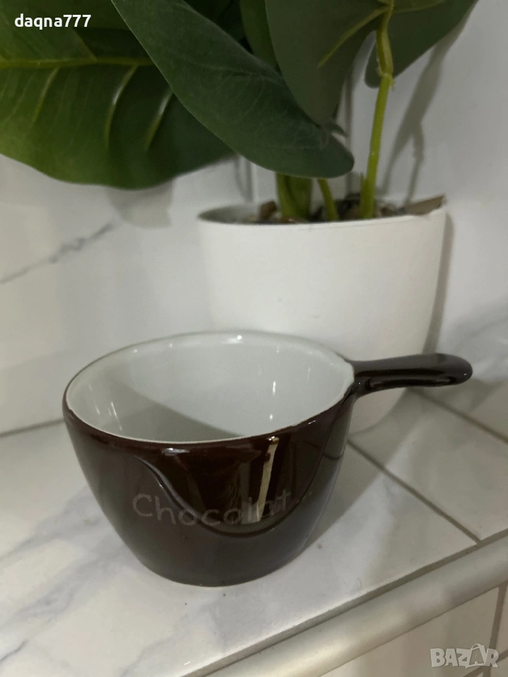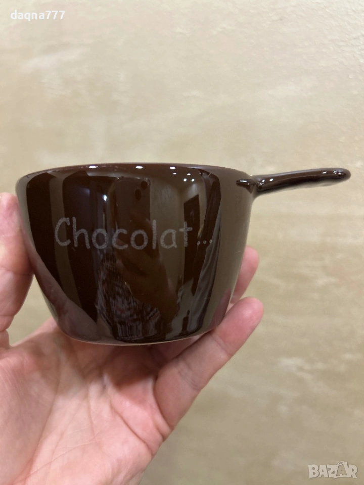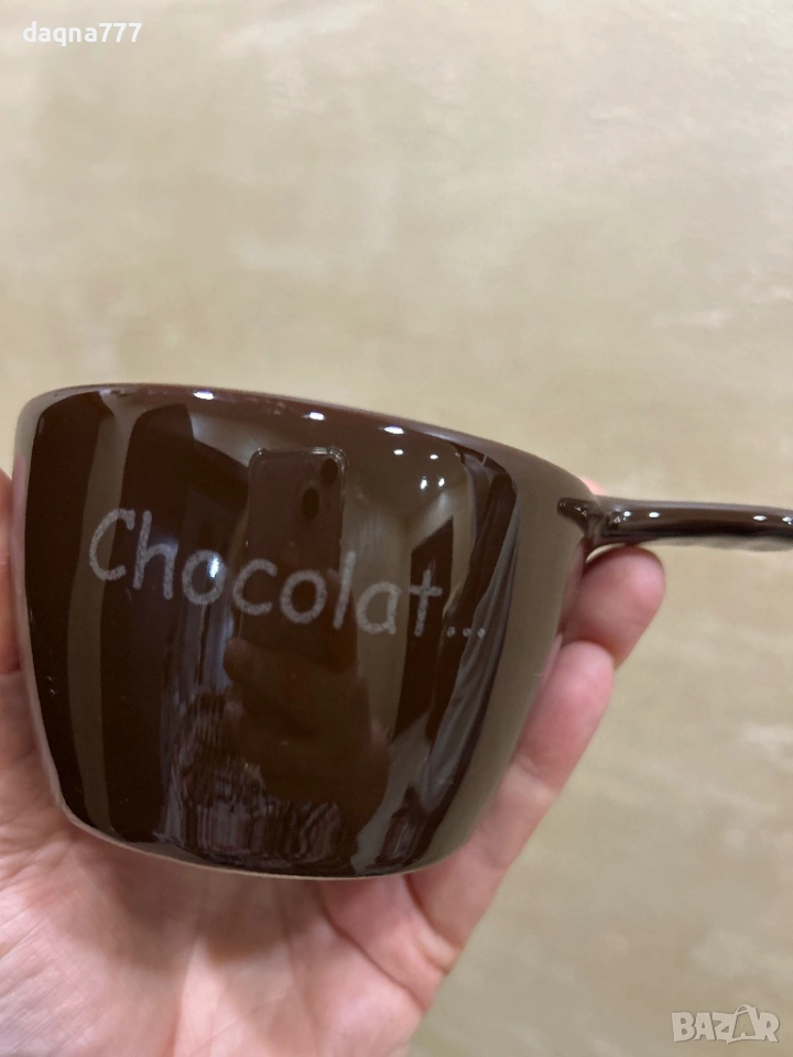 Керамична чаша с гланцово кафяво покритие, наподобяващо цвета на разтопен шоколад.
