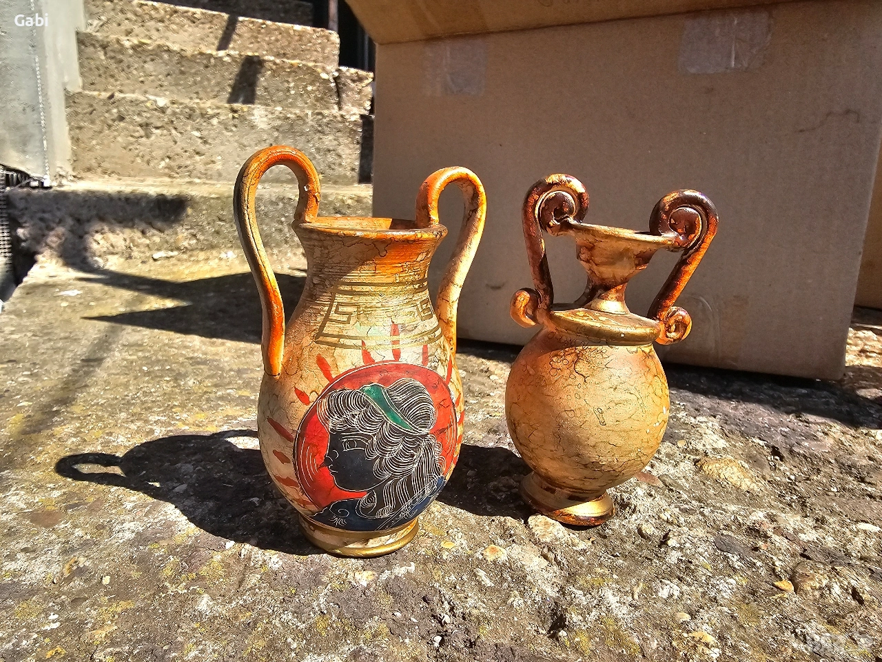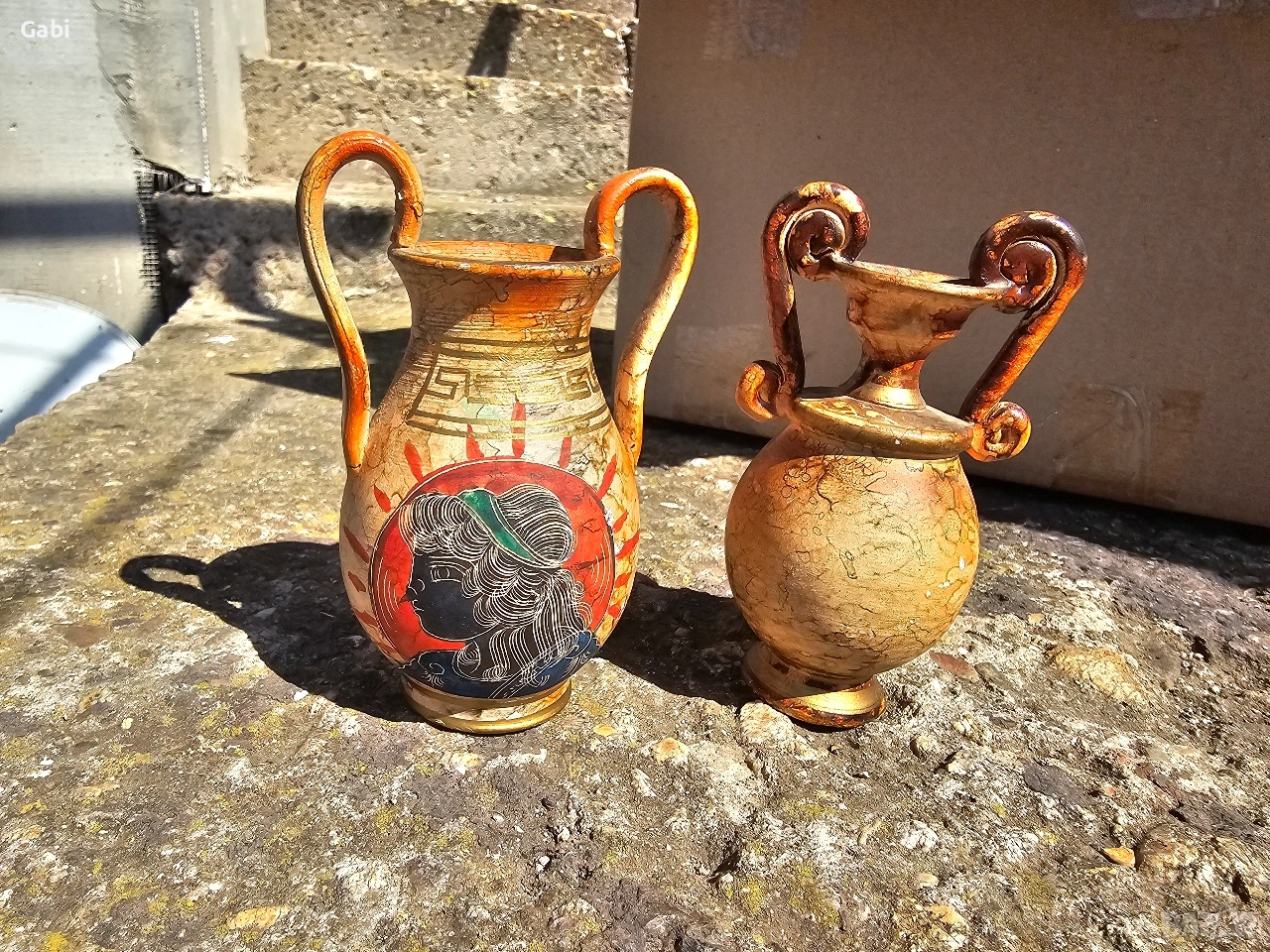 Продавам комплект от два изящни керамични съда (миниатюрни амфори), изработени в класически античен стил. Те са идеален акцент за интериорна декорация или за подарък на ценители на историята и изкуството. Тяхната височина е около 12 см, ръчно изработени с висококачествена керамика с автентичен състарен ефект.