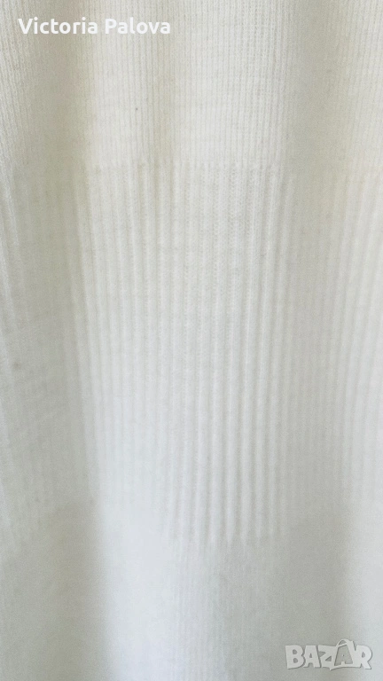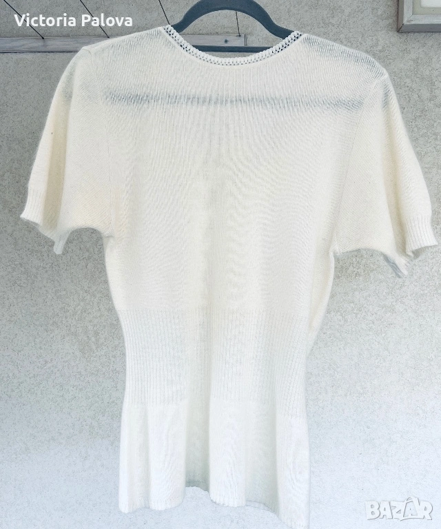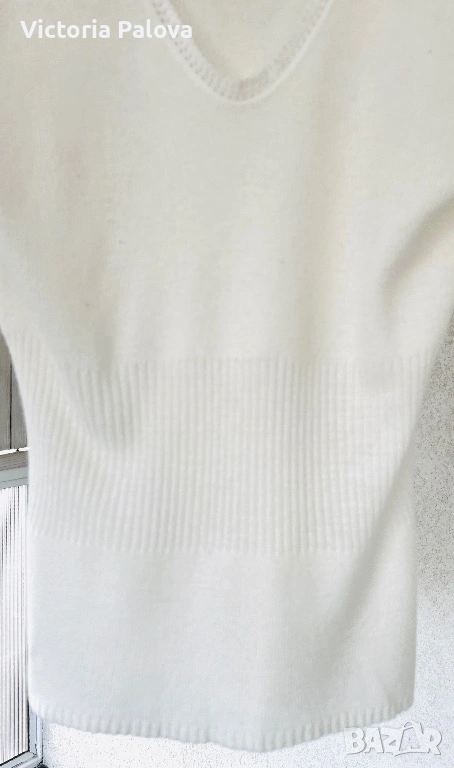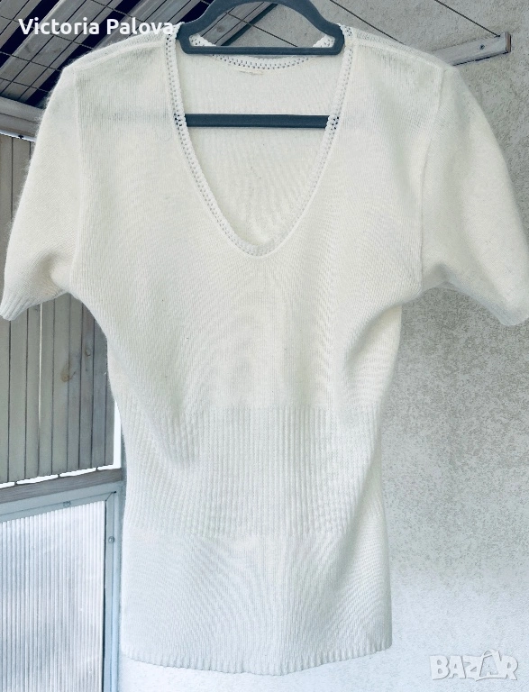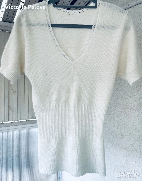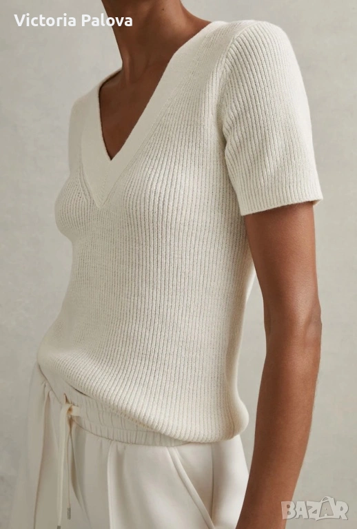 Модельт е с елегантно V-образно деколте и изящна плетка. Най-красивата част е структурираният рипс на талията, който не само държи формата, но и прави фигурата визуално по-стройна. Цветьт е меко мляко, което освежава лицето и придава завършен, скъп вид на всеки аутфит.