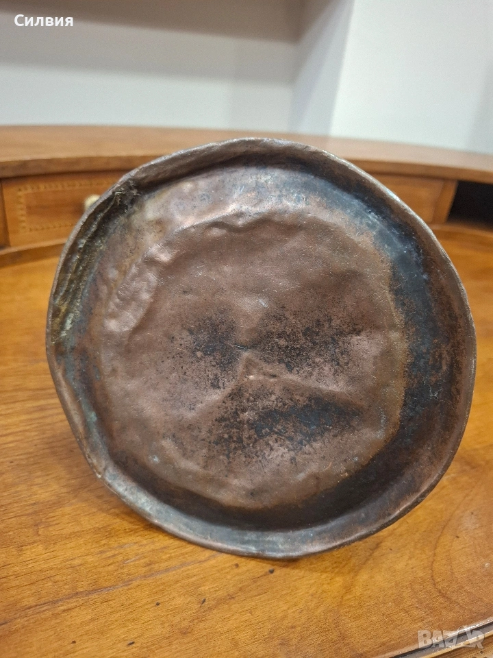 Материал: Изработена е от кована мед, която с времето е придобила естествена патина, придаваща характерен античен вид.