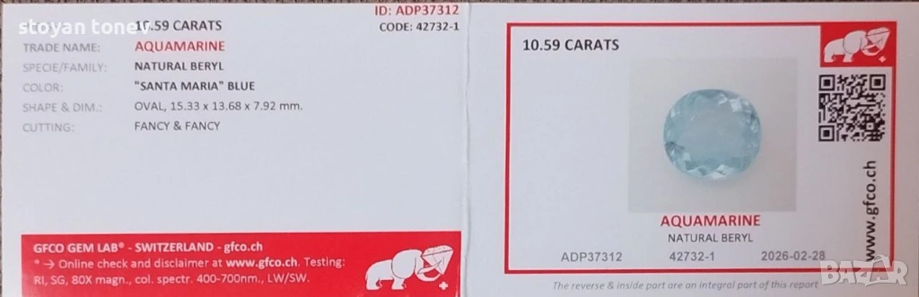 СЕРТИФИКАТ ОТ GFCO GEM LAB (Швейцария) – номер ADP373312 / код 42732-1, издаден на 28.02.2026 г.