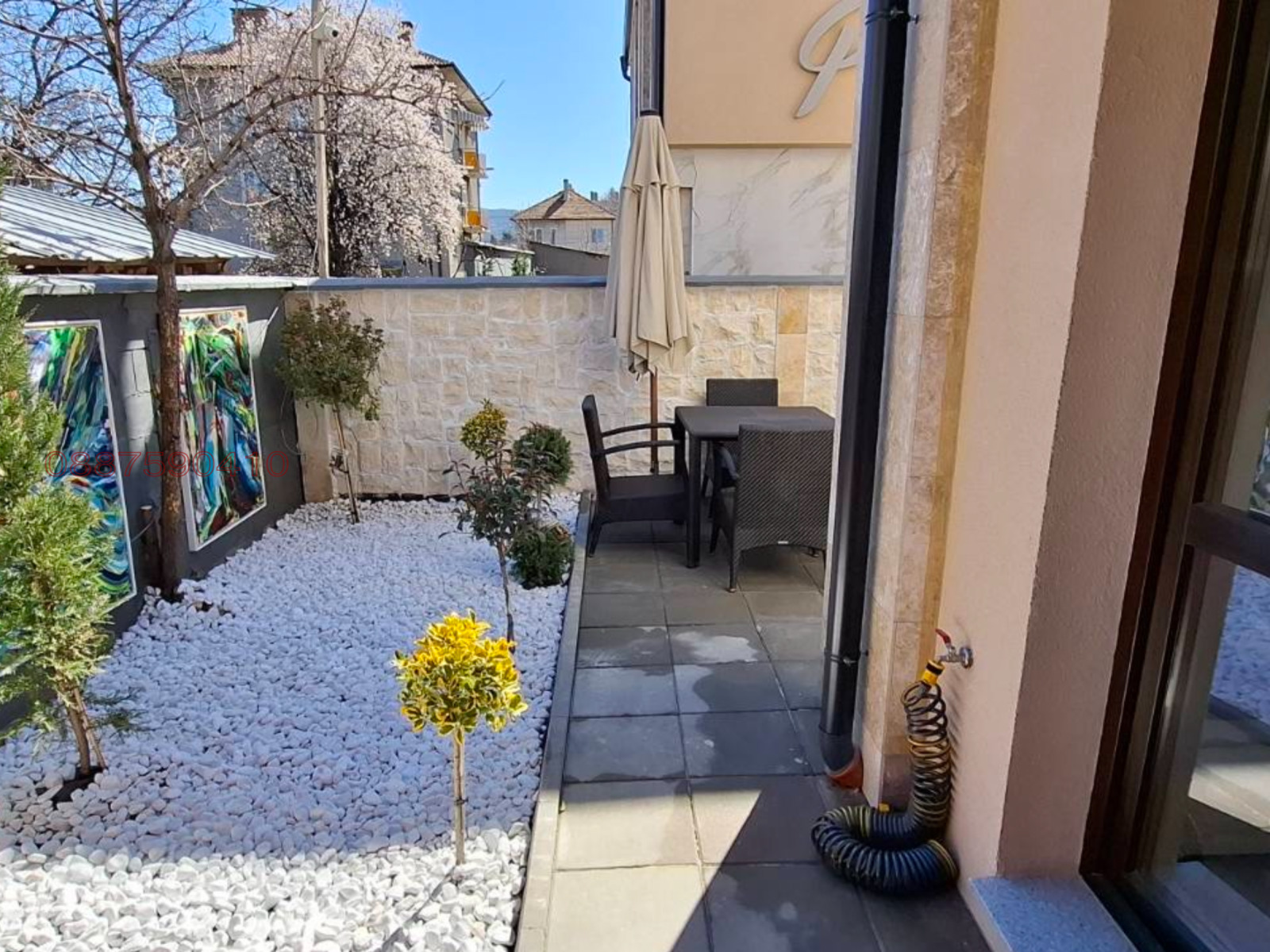 2- ри етаж- 2 спални,коридор, баня. Изпълнена с високо качествени материали, облицовки по фасади от травертин, мрамор, немски композитен декинг, озеленен двор и облицована веранда, тухли Винебергер, баумит изолация 10см на подове и стени, силиконова мазилка Баумит, безшевни улуци, блиндирана врата., на шпакловка и замазка. Модерно обзавеждане с качествени материали, мебели по поръчка.