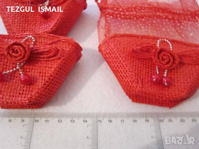 Декоративни червени подаръчни торбички, изработени от мрежест материал и органза, 10 см., 1 брой -1.20 €.