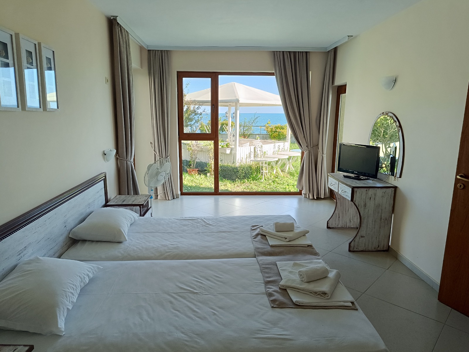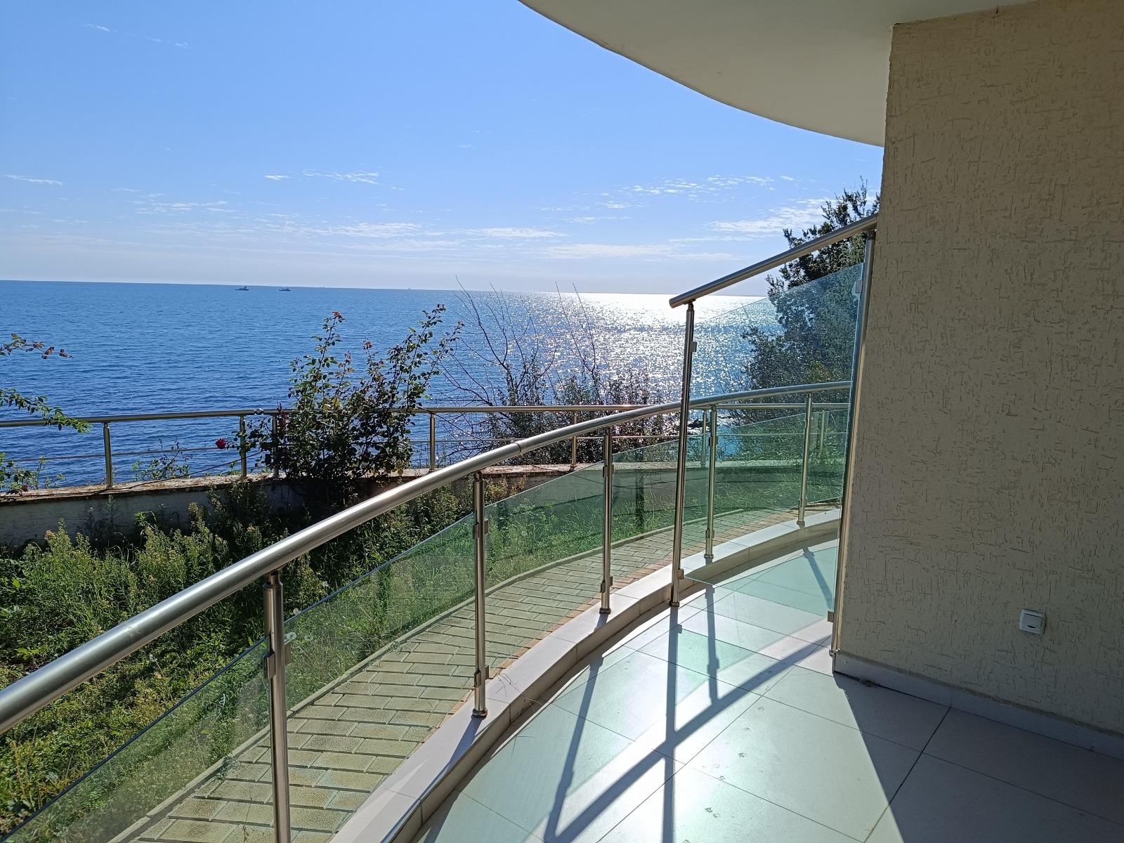 Имотът се намира между гр. Балчик и гр. Каварна, 82 кв.м. РЗП, непосредствено до морския бряг в 4 етажна сграда, с прекрасна морска панорама. Апартамента е с разпределение антре, спалня, дневен тракт с тераса, баня с тоалетна, обзаведен и оборудван. Към комплекса има басейн, много добре подържани общи части и озеленяване на двора.