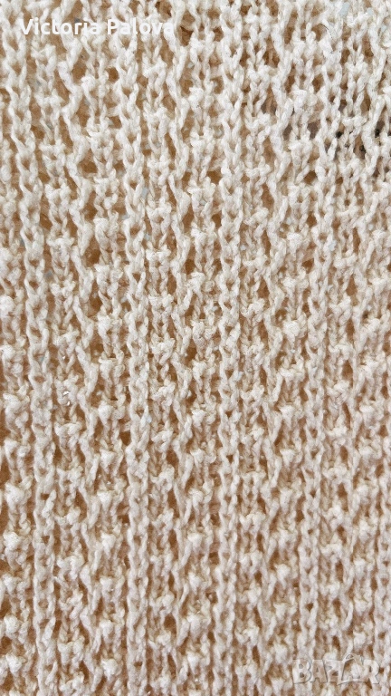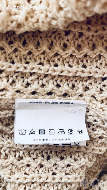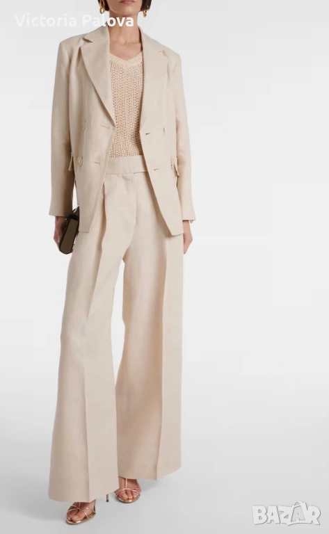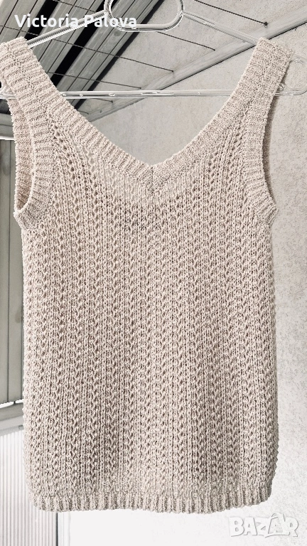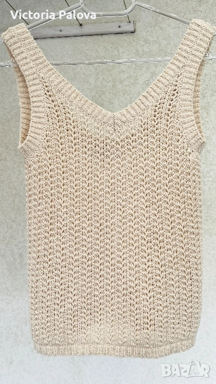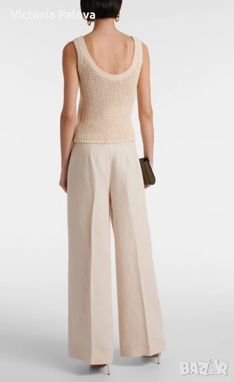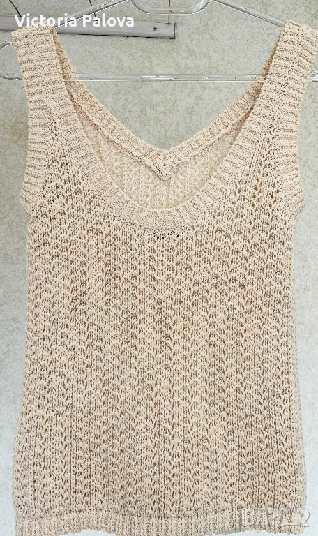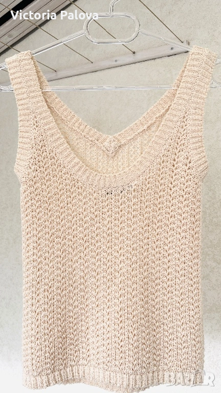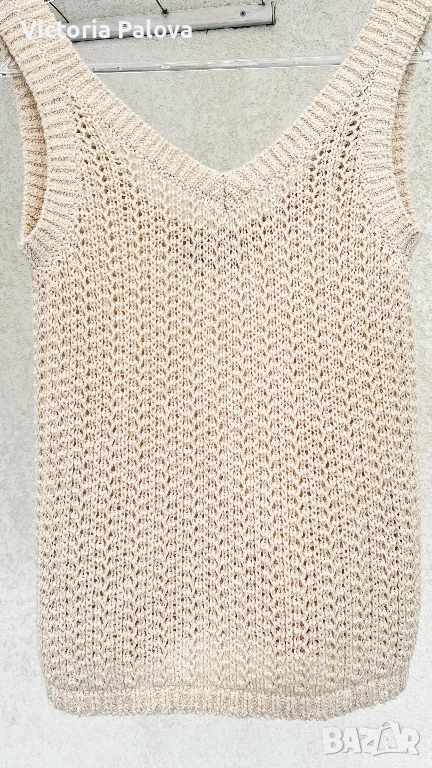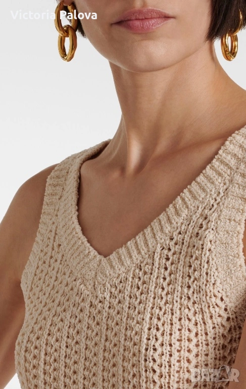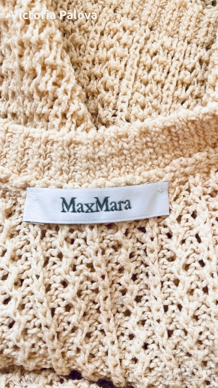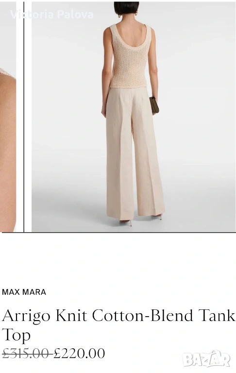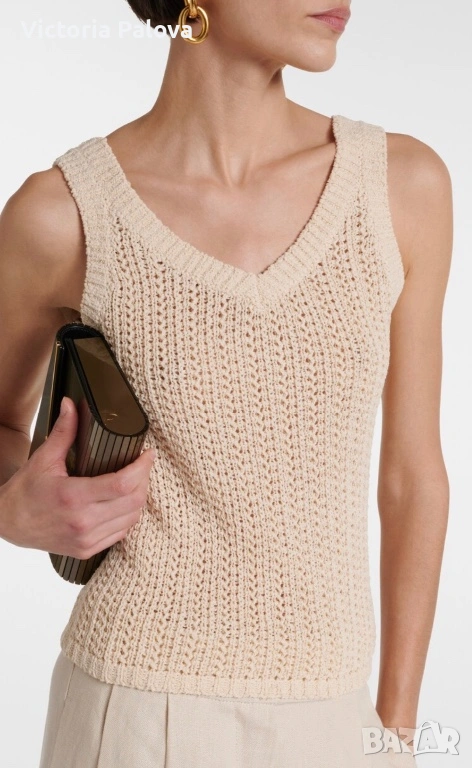 Max Mara, модел Arrigo. Този продукт е олицетворение на италианския шик и „тихия лукс“ – концепция, която марката налага от самото си основаване през 1951 г. Max Mara е световен еталон за безкомпромисно качество и дискретна елегантност, насочена към съвременната жена, която цени прецизните кройки и благородните материи .Топът е изработен от луксозен микс от 76% памук и 24% полиамид, осигуряващ мекота, еластичност и комфорт през целия ден. Дизайнът се отличава с ажурна плетка в изискан бежов нюанс „Bianco Tela“, който придава ефирност на визията. Моделът е с интересен силует с класическо V-образно деколте отпред и елегантно заоблено (кръгло) деколте на гърба, което добавя модерен акцент към визията. С обща дължина от 51 см, топът е леко скъсен - идеален за съчетаване с панталони или поли с висока талия. Завършен с деликатни оребрени краища, този модел е дългосрочна инвестиция в гардероба, носеща духа на италианското майсторство и непреходния стил, характерен за всяко изделие на Max Mara.
