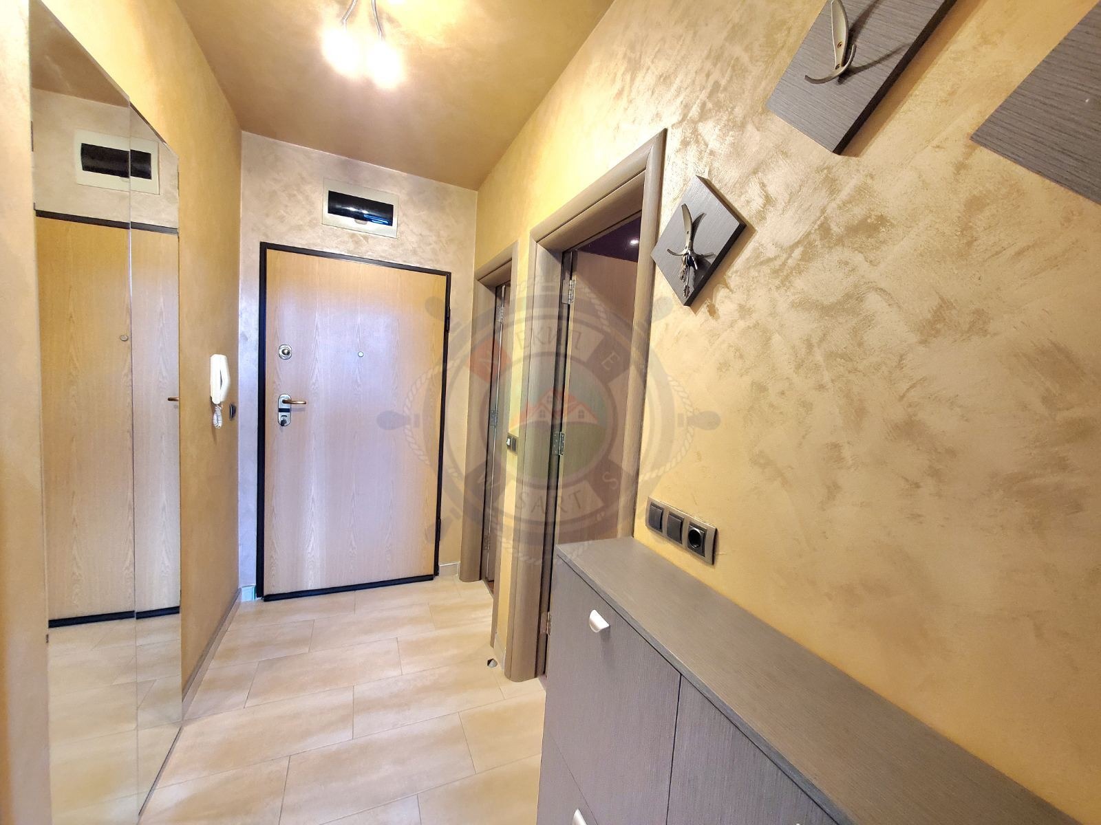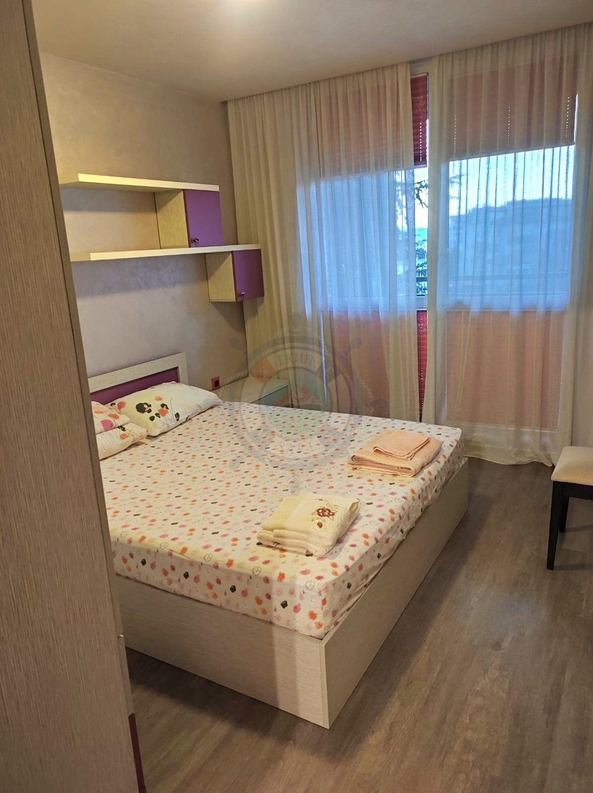 Апартаментът се намира на среден етаж, с изложение запад. Двете стаи са с достъп до тераса, Коридора е с вграден гардероб с предвидено място за дрехи и обувки както и ниша съхранение на вещи.