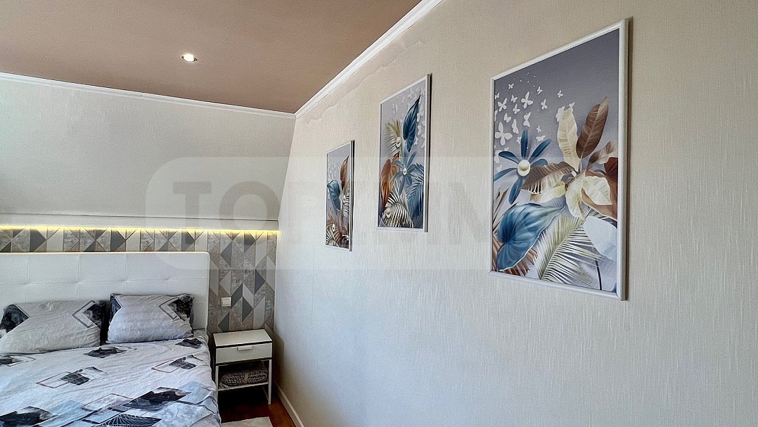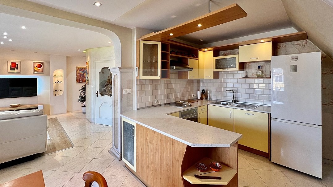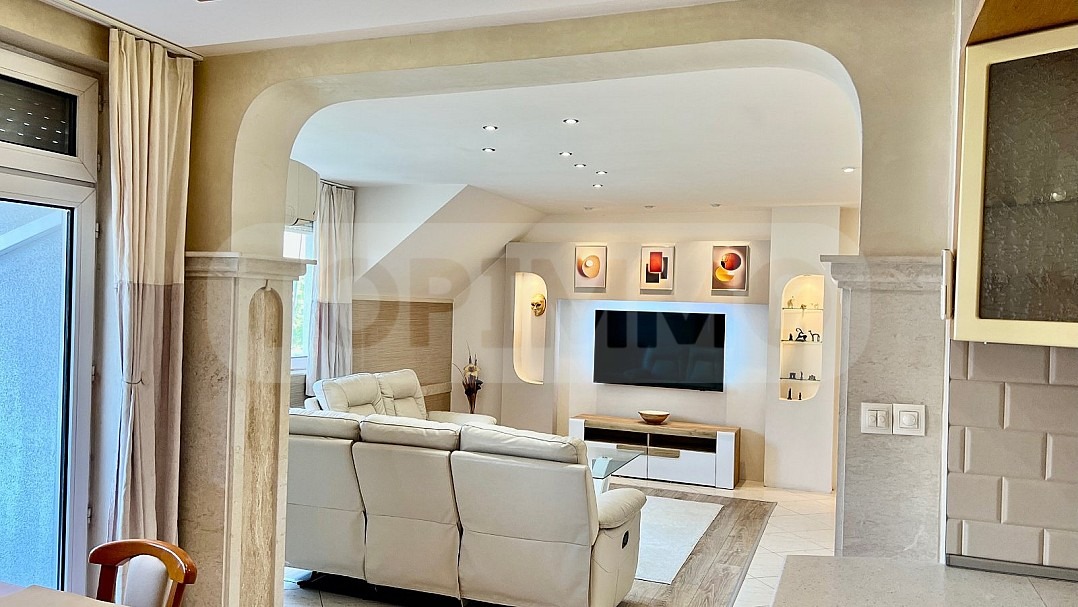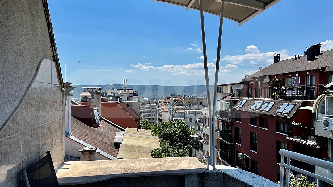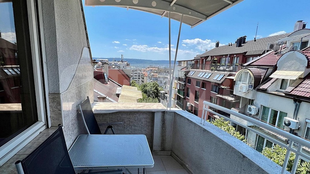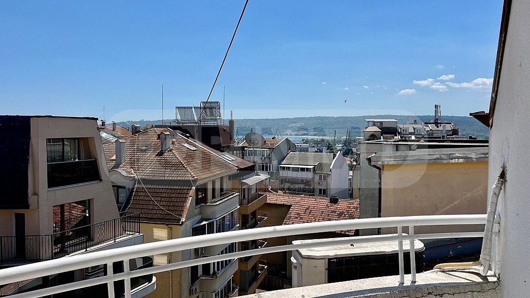 Апартаментът е разположен на последен етаж в тухлена сграда без асансьор. Състои се от антре, дневна с кухненска част, две спални, баня с тоалетна и тераса с гледка към Варненския залив.
