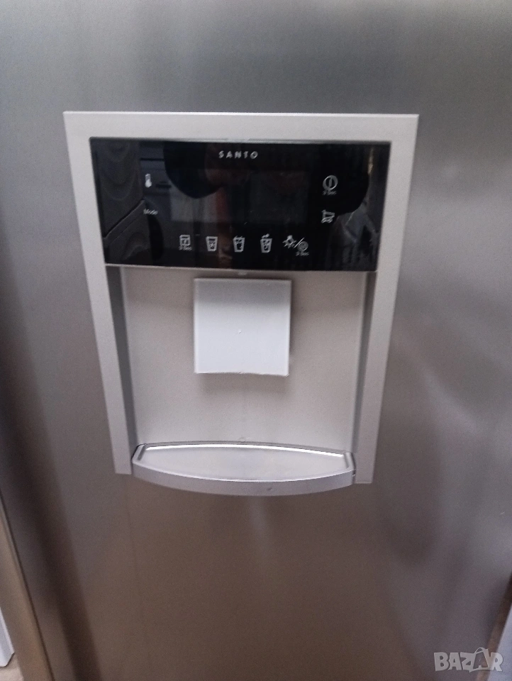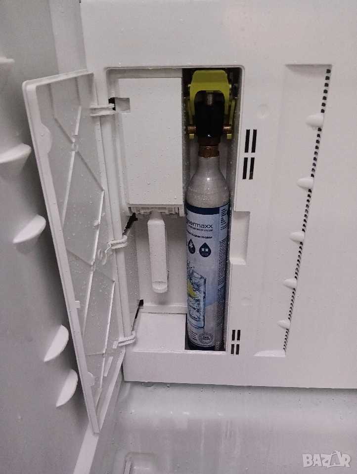 Хладилникът е с диспенсър за вода и бутилка с CO2, подвързва се към водопровода и от диспенсъра тече три вида вода по желание студена вода, леко газирана студена вода и много газирана студена вода!