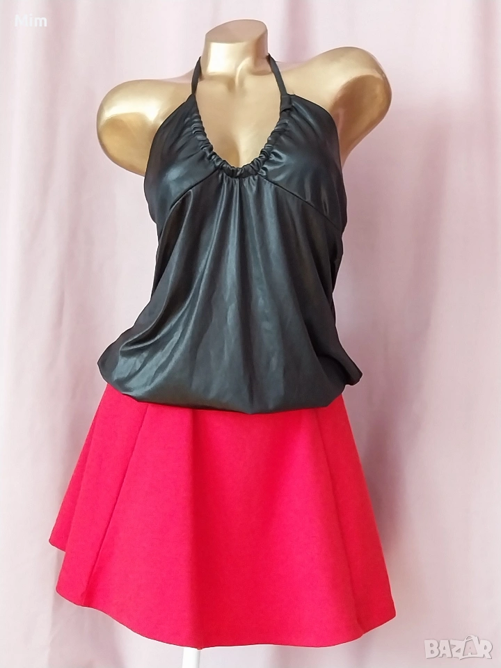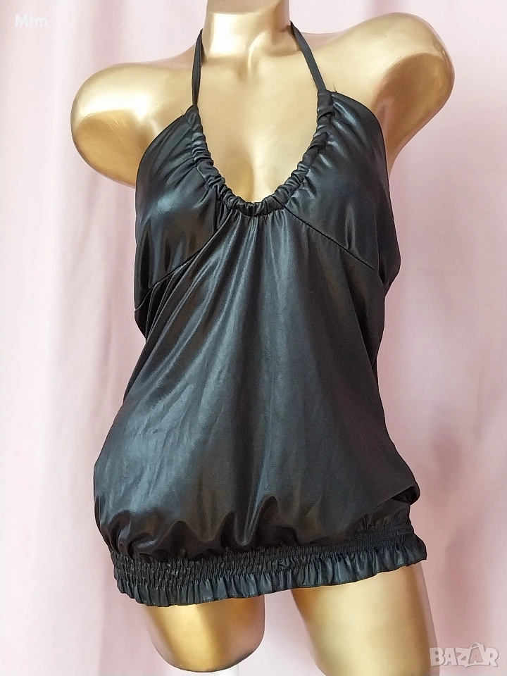 2-XL Черен тънък потник имитиращ еко кожа отдолу с ластик, завързва се през вратът, гръдна от 90 до 110 см еластичност, дължина 70 см