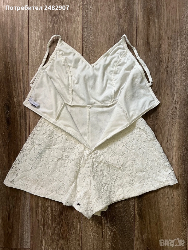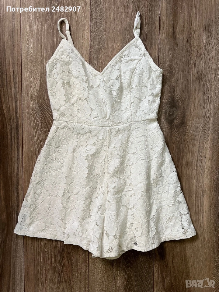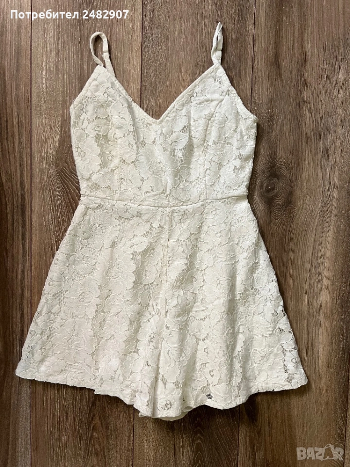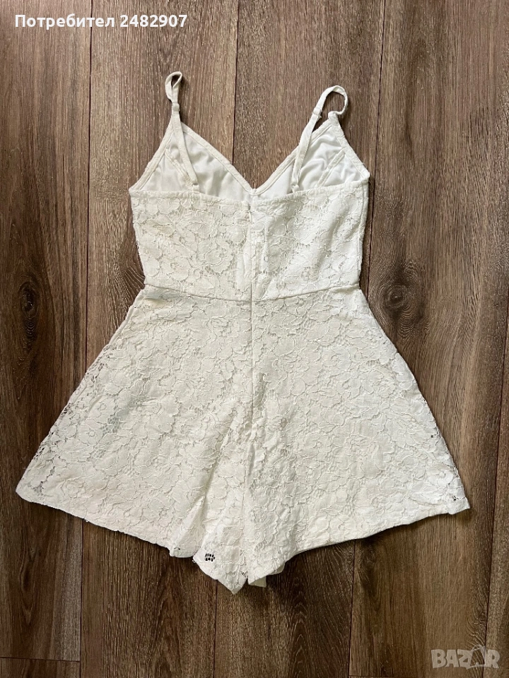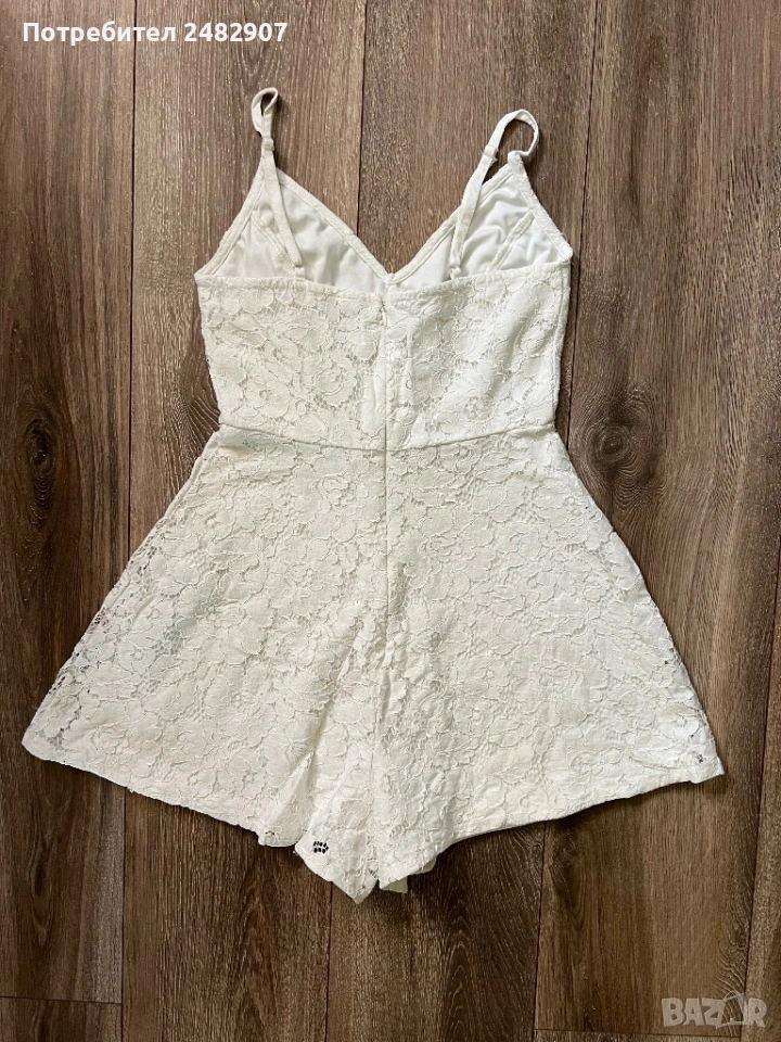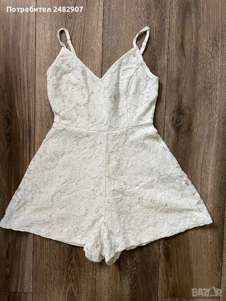 Бял дамски гащеризон от дантела, размер 32. Съдържа 100 % полиестер. Ширина под мишниците - 36 см, ширина в талията - 31 см, дължина от талията до чатала - 34 см, дължина от горната част на презрамките до долу - 68 см, ширина на крачола в долната част - 44 см. Много запазен, обличан веднъж за повод, с регулируеми презрамки, подплата и скрит английски цип на гърба (31 см).