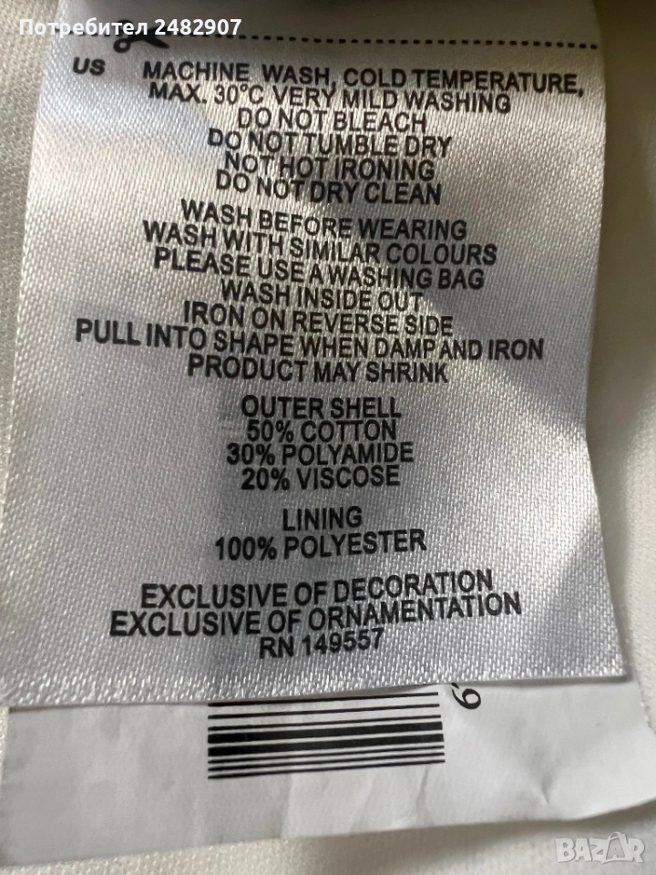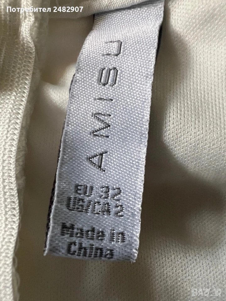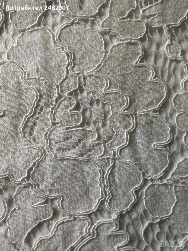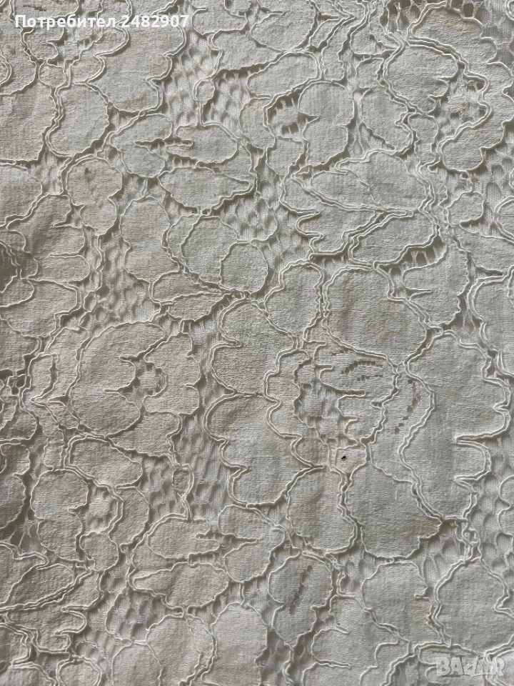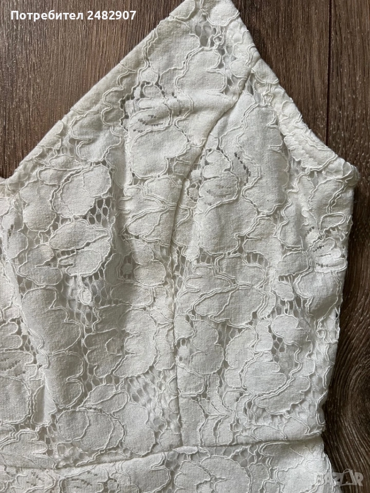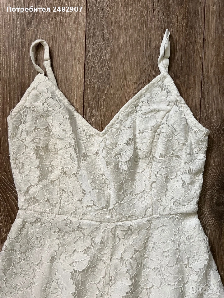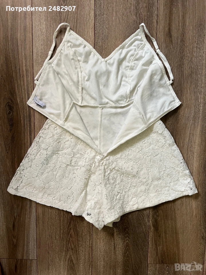 Бял дамски гащеризон от дантела, размер 32. Съдържа 100 % полиестер. Ширина под мишниците - 36 см, ширина в талията - 31 см, дължина от талията до чатала - 34 см, дължина от горната част на презрамките до долу - 68 см, ширина на крачола в долната част - 44 см. Много запазен, обличан веднъж за повод, с регулируеми презрамки, подплата и скрит английски цип на гърба (31 см).