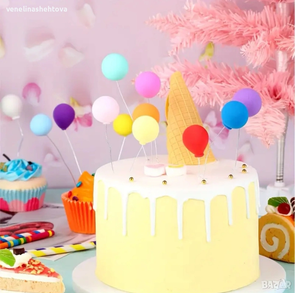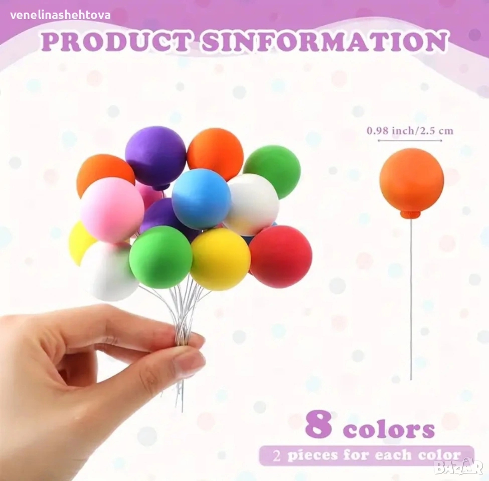16 броя изкуствени мини балони на тел шарени декорация на торта → Обява 53896354