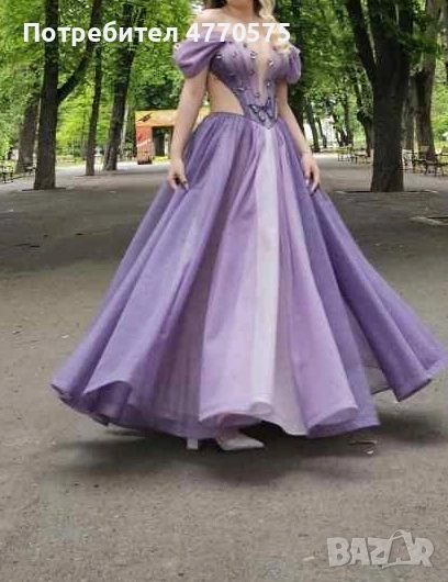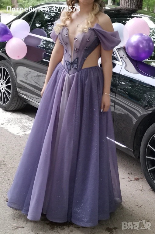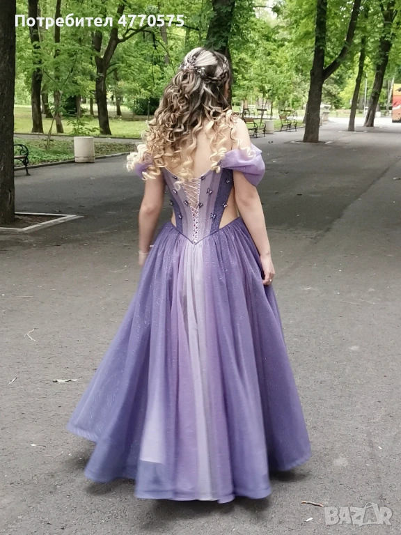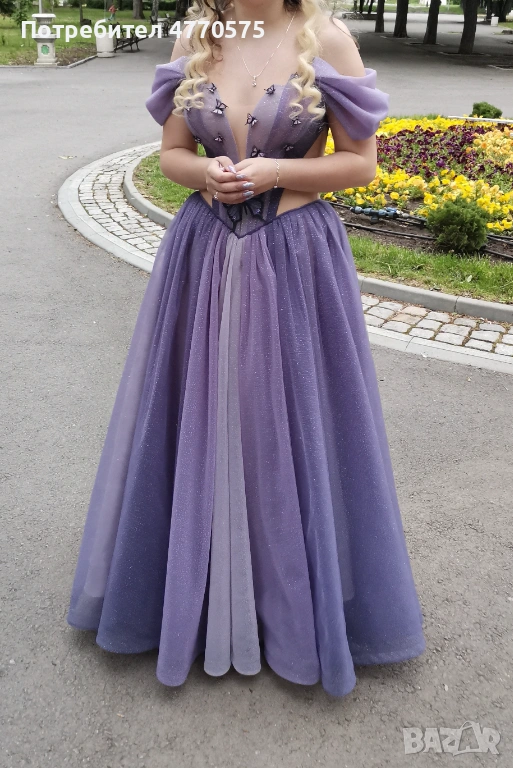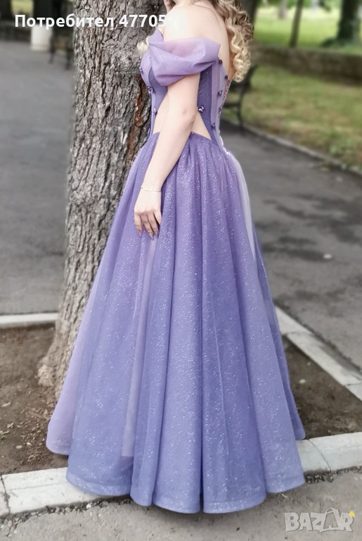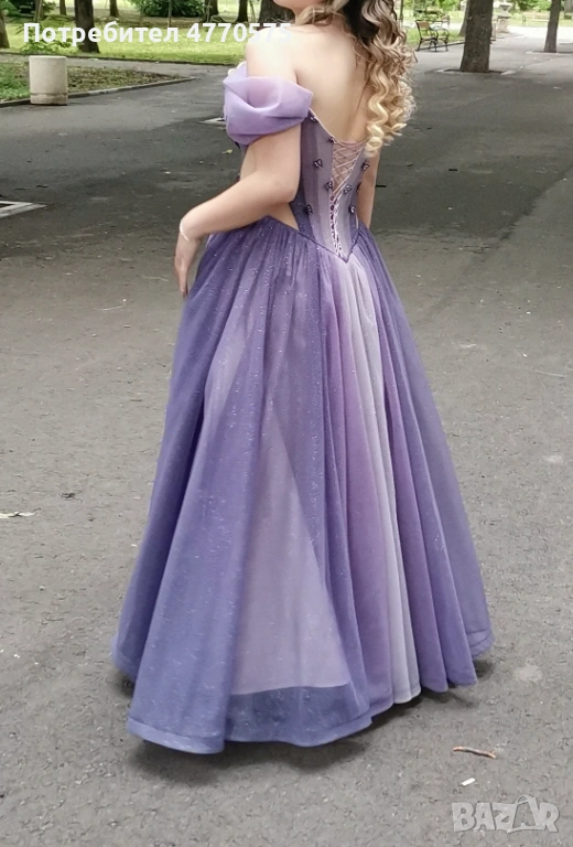 Роклята е в три нюанса на лилаво, които се преливат с лек блестящ ефект. Горната част е тип корсет и се носи без сутиен. Може да пасне на всяка гръдна обиколка. Падналите ръкавчета могат и да се махнат.