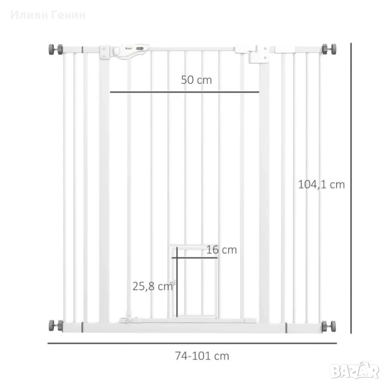 Размери на продукта на портата: 68Ш x 104,1В см. Подходяща за разстояния от стената между 74 и 101 см. Моля, измерете разстоянието до касата на вратата или стената преди покупка. Необходим е монтаж.
