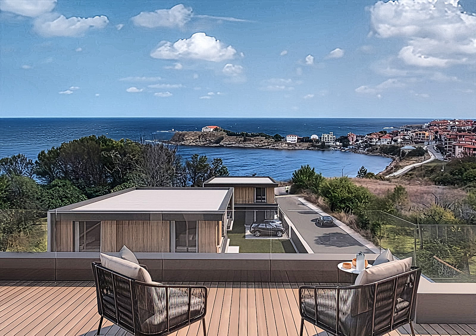 Това е малка бутикова сграда с модерен средиземноморски дизайн.