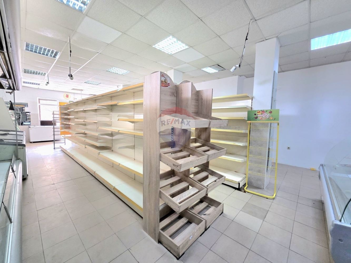 - просторна търговска част /90кв.м./, която има всичко необходимо като обзавеждане за функционирането на хранителен магазин. Размерите на търговската част са: ширина 7м, дължина 14м, височина 3,20м