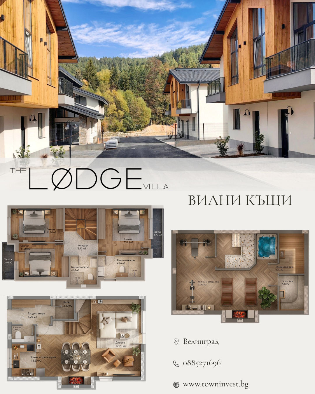 The Lodge Villas е малък бутиков комплекс от затворен тип . Състои се от общо десет къщи в два различни вида. Обектът е позициониран на територията на гр.Велинград. На разстояние 200м от Арте Спа и Парк хотел и Термален къмпинг Велинград .