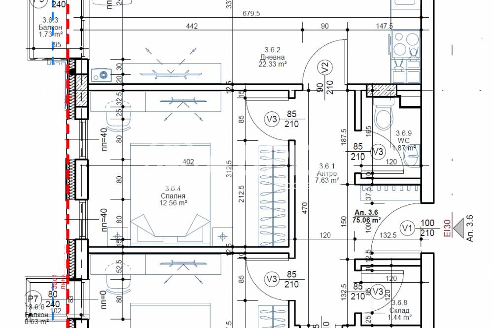 Тристаен апартамент на етаж трети с РЗП-89,36м2, ЗП-75,06м2 и разпределение: антре, дневна с кухненски бокс и трапезария-22,33м2, две спални-12,56 и 12,36м2, баня с тоалетна-3,57м2, мокро, склад и два балкона. Отпление ГАЗ. Налични ПМ и гаражи. Цените са без включен ДДС.