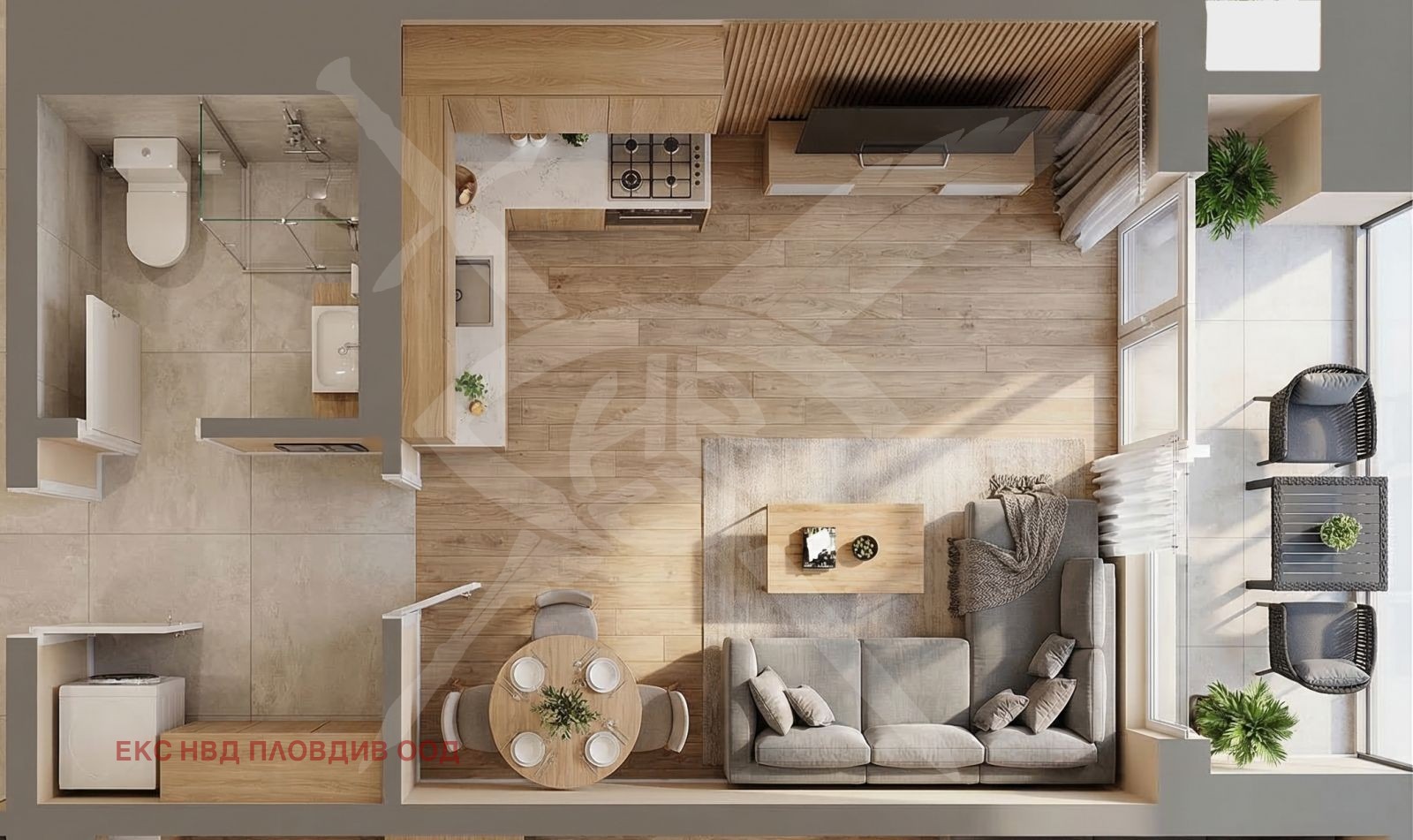 РАЗПРЕДЕЛЕНИЕ: Жилището се разгръща върху 39 кв.м. добре организирано пространство, включващо приветливо антре, практичен килер, баня с тоалетна и светла всекидневна с кухненски бокс, която естествено преминава към тераса.