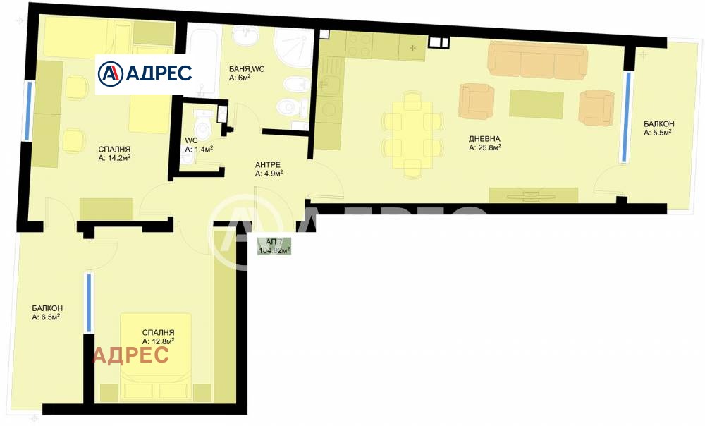 Прекрасен тристаен апартамент, състоящ се от дневна 26кв.м. , две спални по 14 и 13кв.м., баня с тоалетна, тоалетна и две хубави тераси.