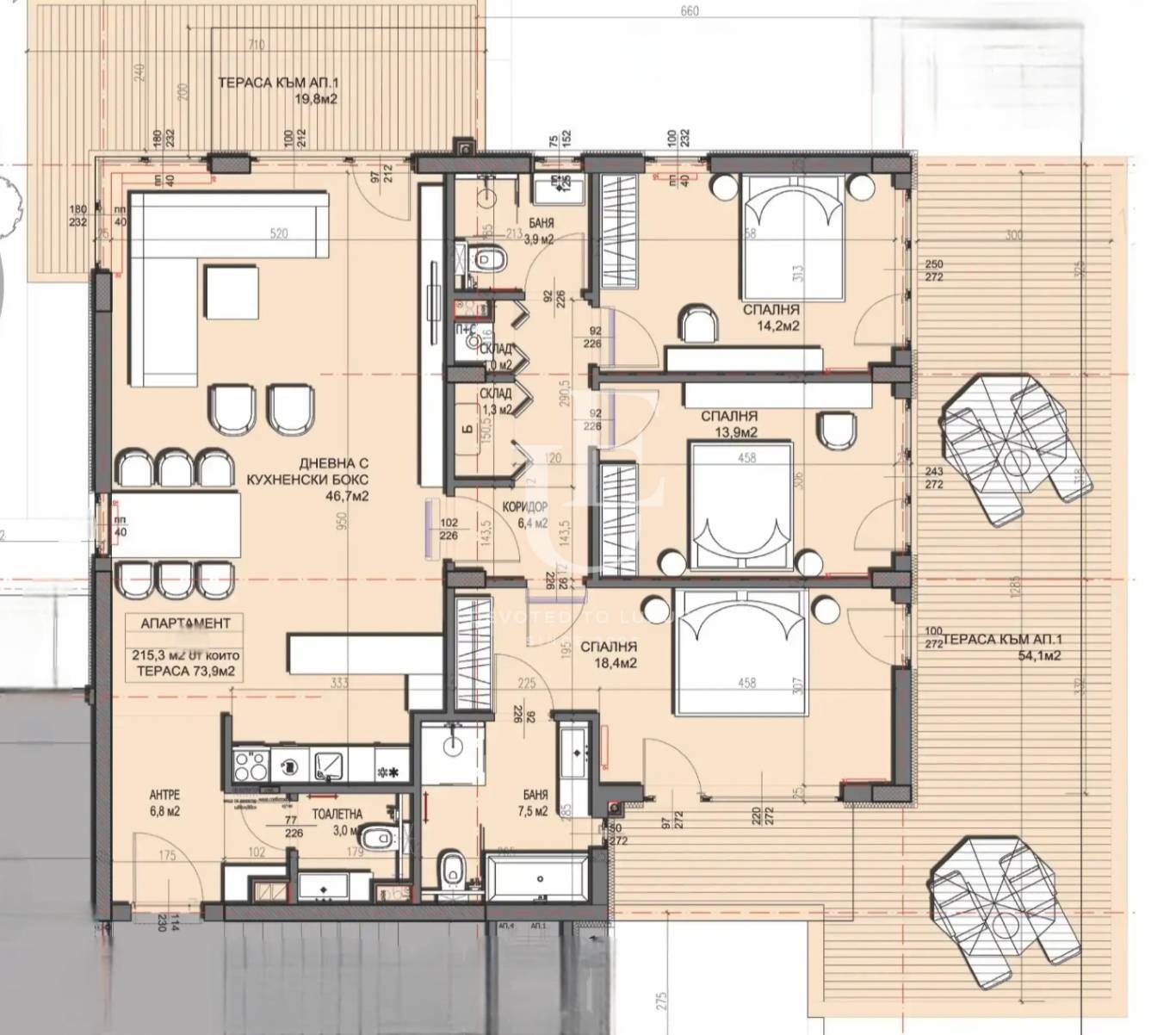 Входно антре, водещо към просторна дневна с кухненски бокс и трапезария с площ 46,7 кв.м и директен излаз към голяма тераса. Три самостоятелни спални родителска спалня с площ 18,4 кв.м и две допълнителни спални съответно 14,2 кв.м и 13,9 кв.м. Две бани с тоалетни, отделна тоалетна за гости, както и две складови помещения. Към апартамента има просторен самостоятелен двор с обща площ 73,9 кв.м. Цената е без включен ДДС. Ref. ID:29085