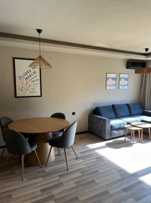 Имотът е обзаведен, с площ 65 кв.м, на 1-ви етаж от 15 етажа в сграда с асансьор. Разпределението включва дневна с кухня и трапезария, две спални и баня с тоалетна.
