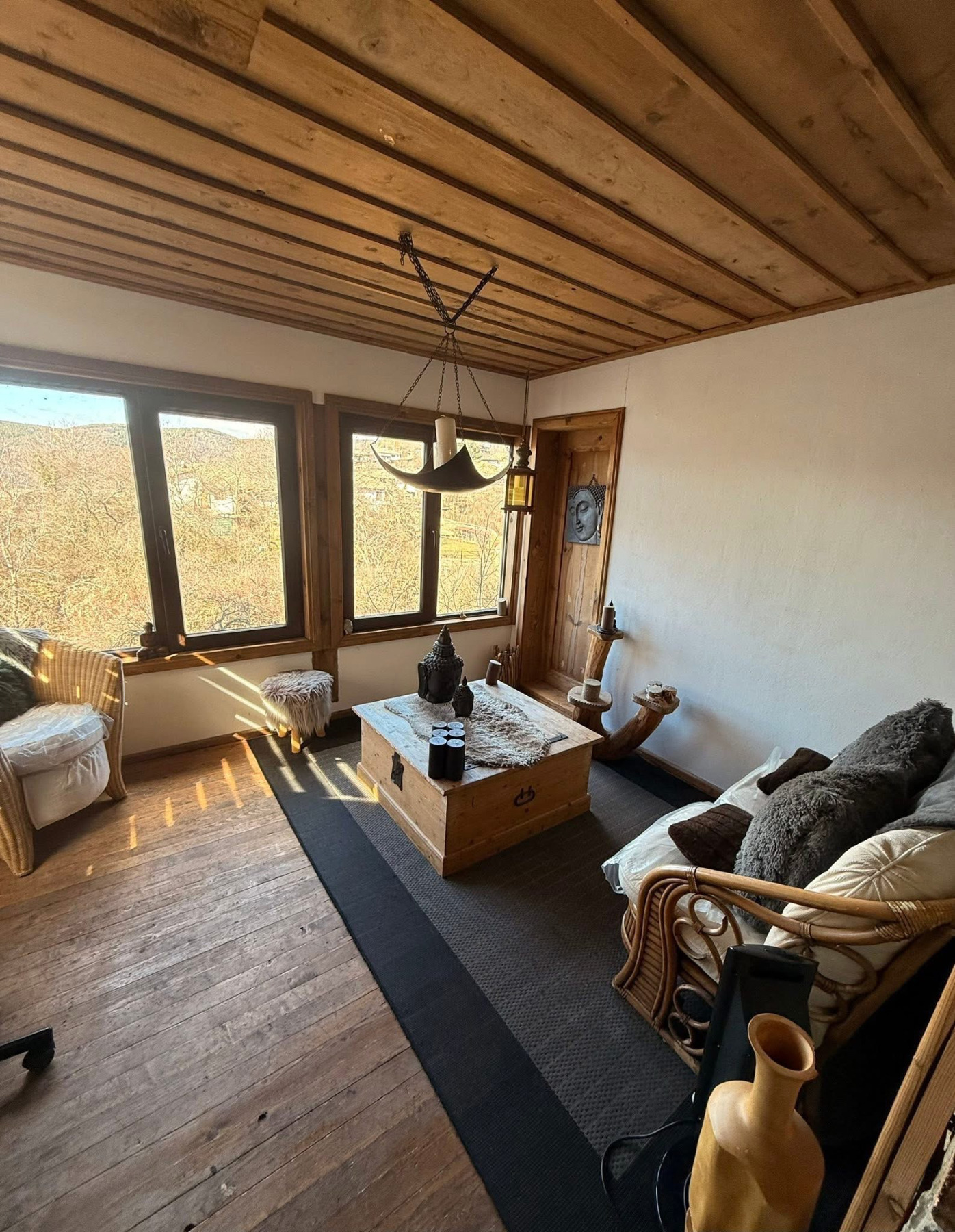 На междинно ниво е разположен и офис/стая за медитация с кокетна тераса.
