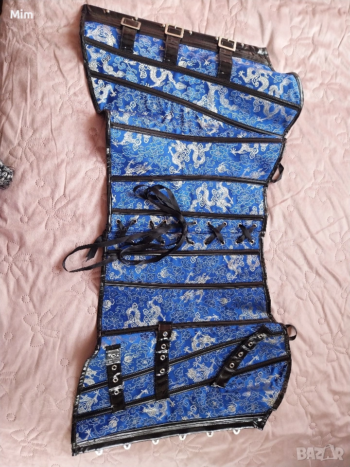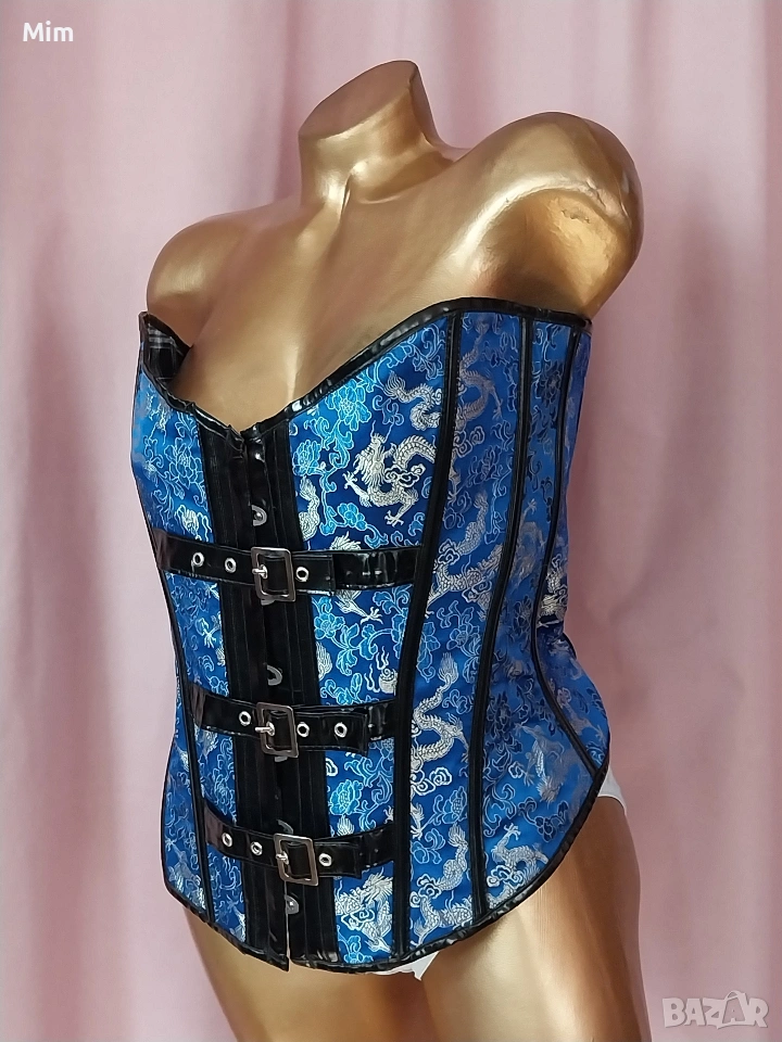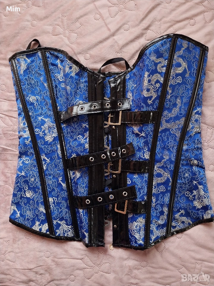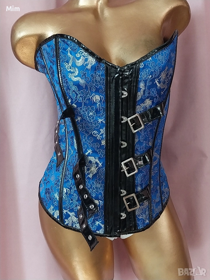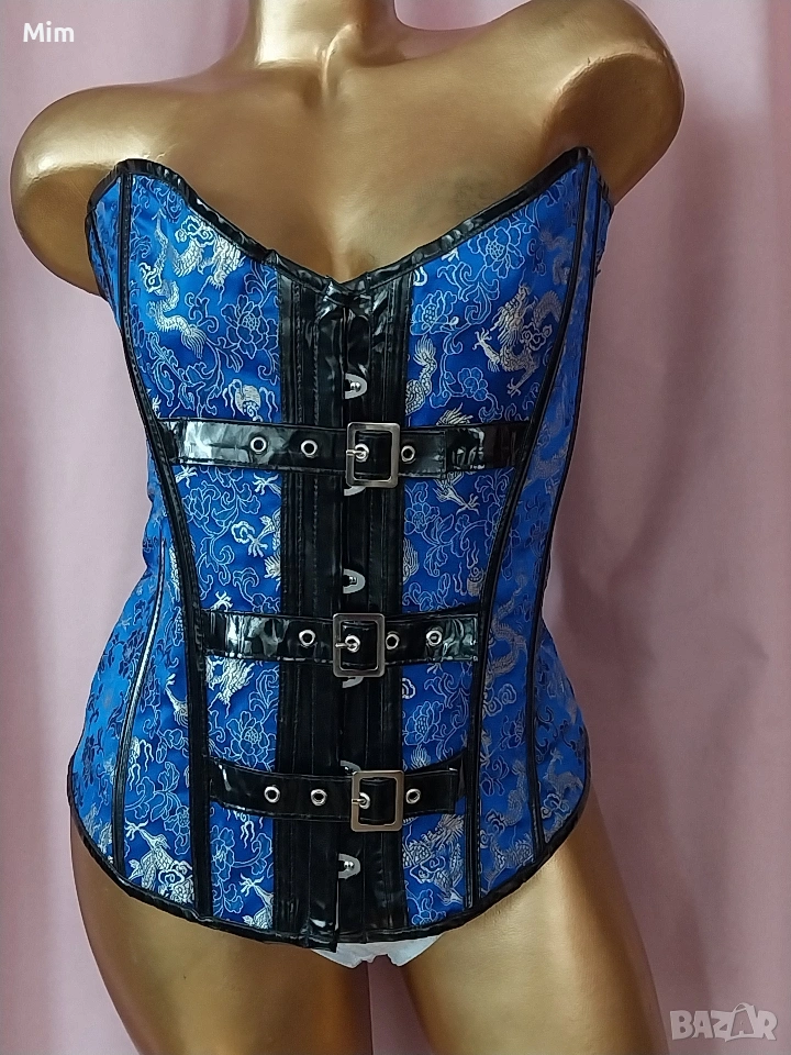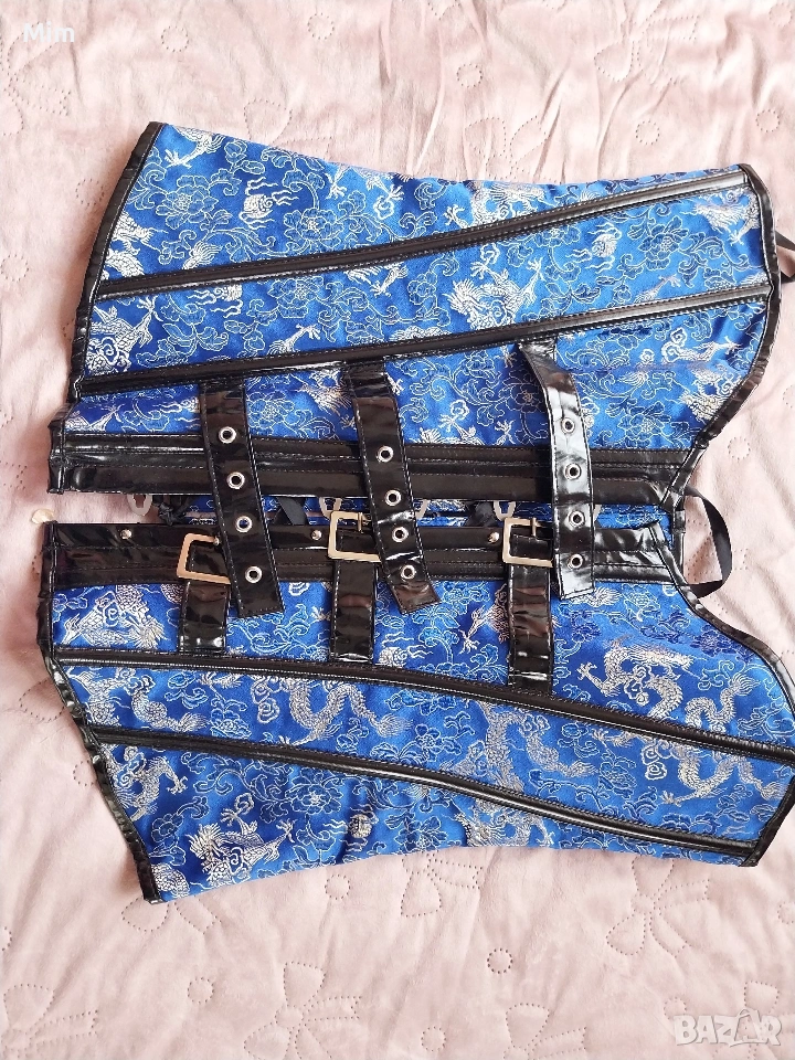 Син сатенен корсет съчетано с черни ивици от кожа / лак / ,отпред с метални банели и метални корсетни копчета с 3 катарами ,отзад със сатенена лента за регулиране на размера по тялото.