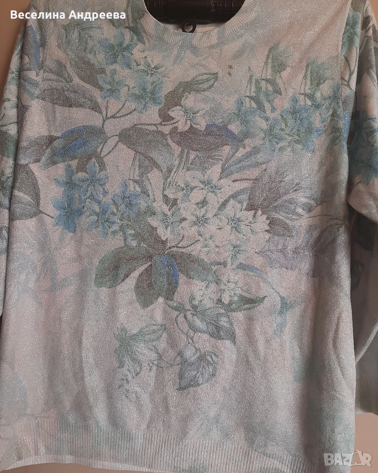 Дамска блуза, дълъг ръкав. Фина, с основен фон бял, със синьо- зелени флорални мотиви. Размер - L/XL. 50%вискоза, 30%найлон, 20% ликра. Цена - 14,32€ (28,00лв.)