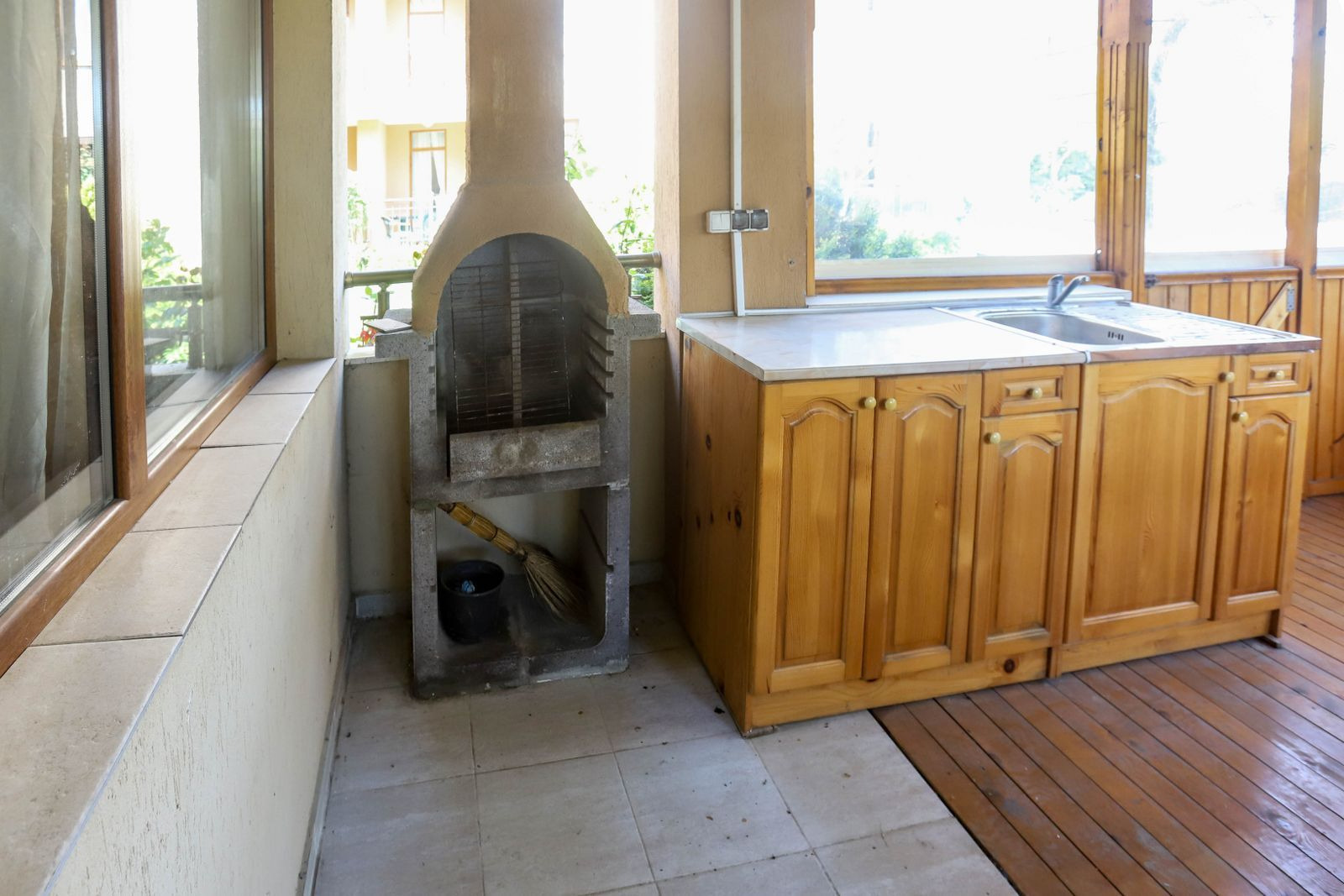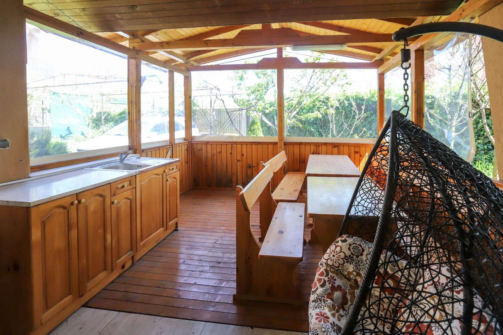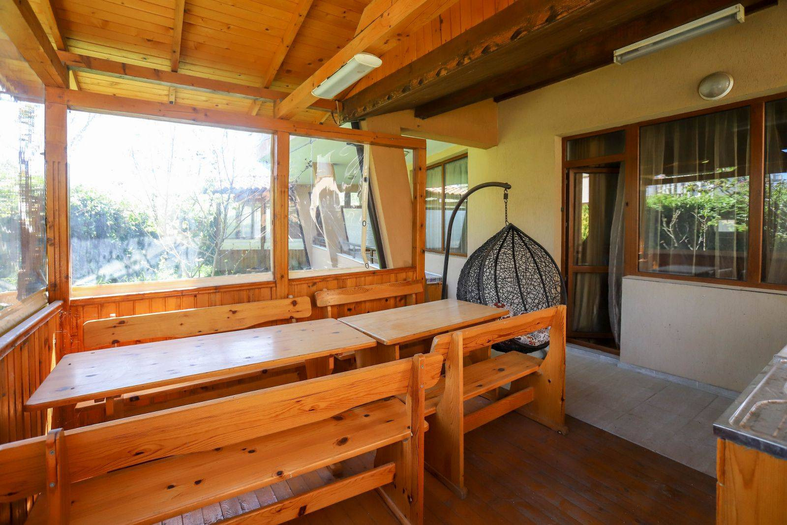 *лятната веранда с барбекю е остъклена и се е получила като малък собствен ресторант с маси, пейки и барбекю.