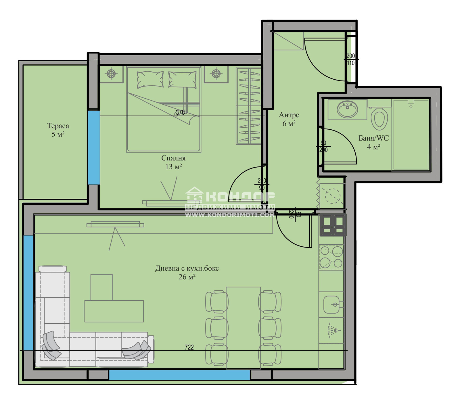 Оферта 63586 - Имаме Удоволствието да ви Предложим Функционален Двустаен Апартамент в луксозна сграда, отличаваща се с модерна и съвременна архитектура в един отлично развиващ се район за живеене райони с отлична локация в близост до Училища, детски градини, удобен транспорт към централна градска част и големи хипермаркети. Проектът е с нисък процент общи части, което дава възможност на клиентите да получат повече реална площ !!! Жилището се състои от просторна, ъглова дневна с трапезария и кухненски бокс /26кв.м./, една самостоятелна спалня 13кв.м., баня с WC, широко входно антре с място за гардероб и една тераса. Сградата се изпълнява от реномирана Строителна Компания, която разполага с множество готови обекти, утвърдила се като една от водещите и Коректни Фирми в Града. Апартаментите ще бъдат завършени според всички изисквания за съвременно строителство - блиндирана врата, 6-камерна дограма, МДФ-вътрешни врати. Луксозни общи части, хидро и топло изолация, хидравличен асансьор, гранитено стълбище, алуминиев парапет. Свободни Подземни Паркоместа . Сградата се намира на Отлично и предпочитано място като локация - ОТЛИЧНА ИНВЕСТИЦИЯ !!!