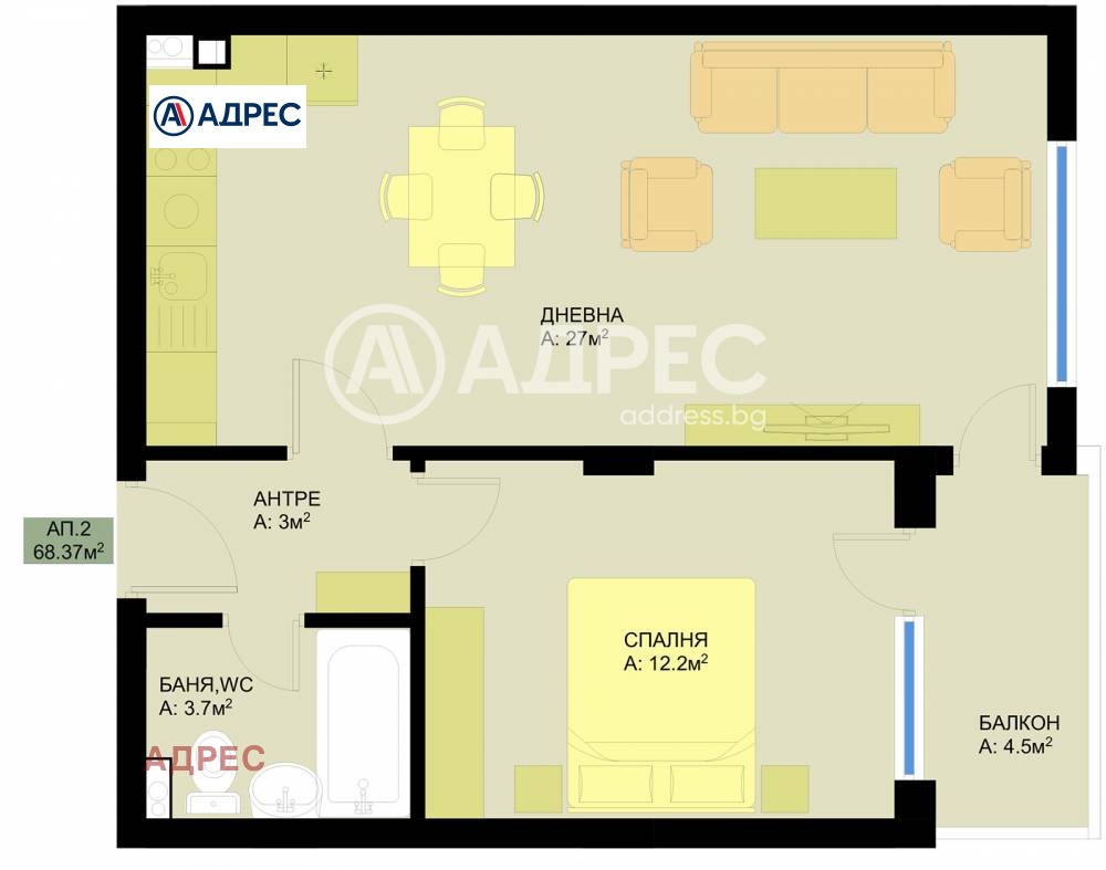 Просторен и светъл Двустаен апартамент. Жилището е с функционално разпределение, като разполага с дневна от 27 кв.м., спалня 12.2 кв.м. , баня и прекрасна тераса 4.5 кв.м.Предпочитано място за много млади семейства и клиенти, търсещи добра инвестиция. С възможност за покупка на паркомясто!