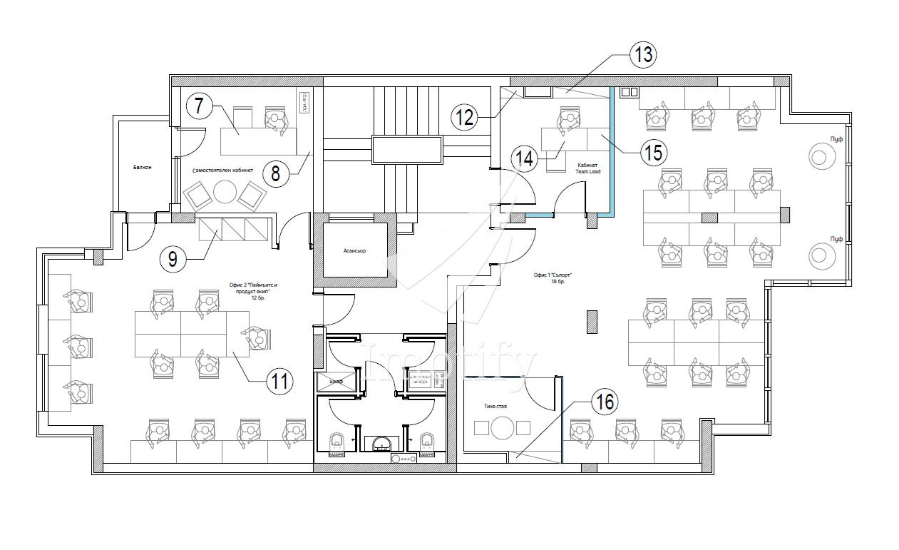 Имотът предлага функционално разпределение, подходящо за екип с нужда от отделни работни пространства: