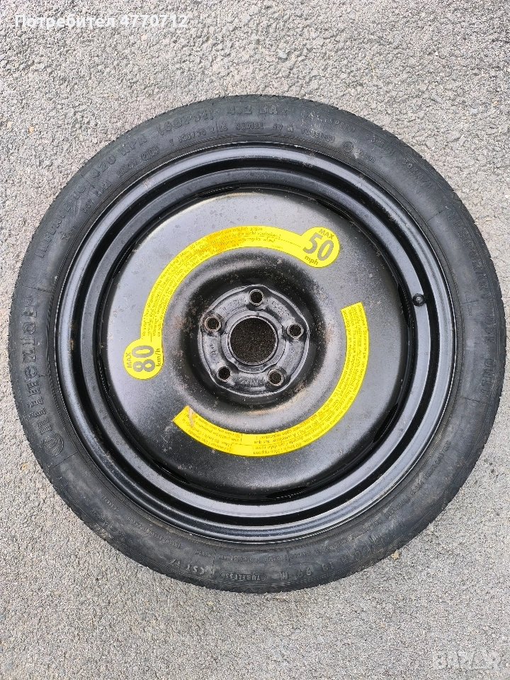 18 цолова резервна гума тип патерица с междуболтово разстояние 5х112, централен отвор 57.1мм., ширина 3.5J, ЕТ 25.5 и гума Континентал с размери 125 70 18.