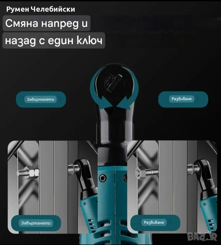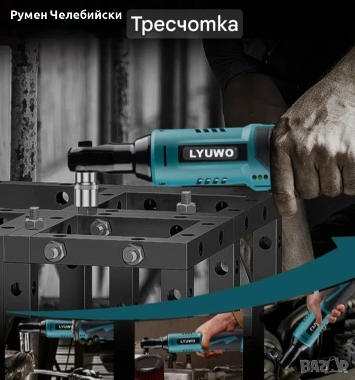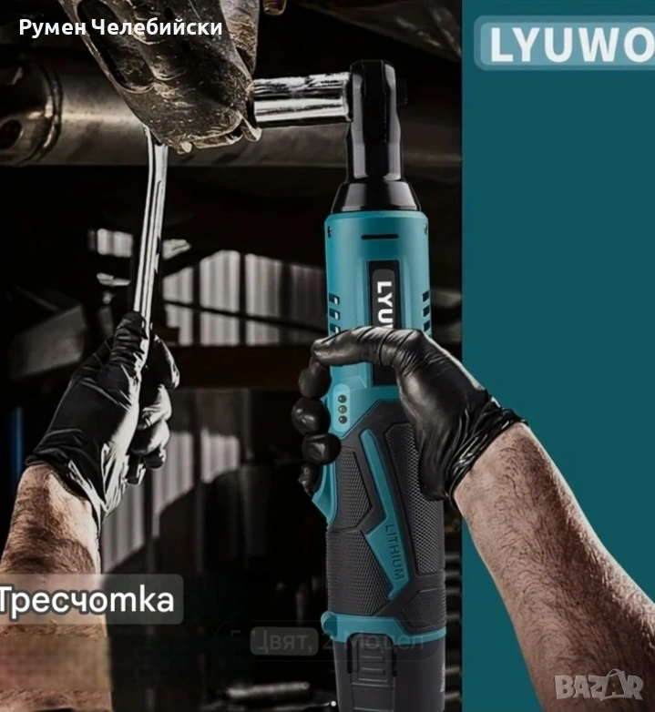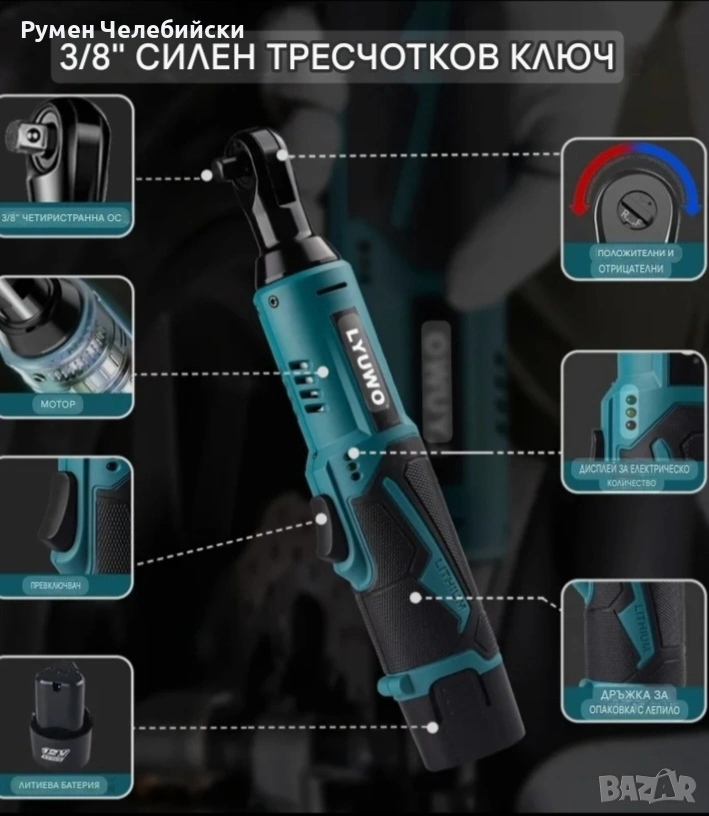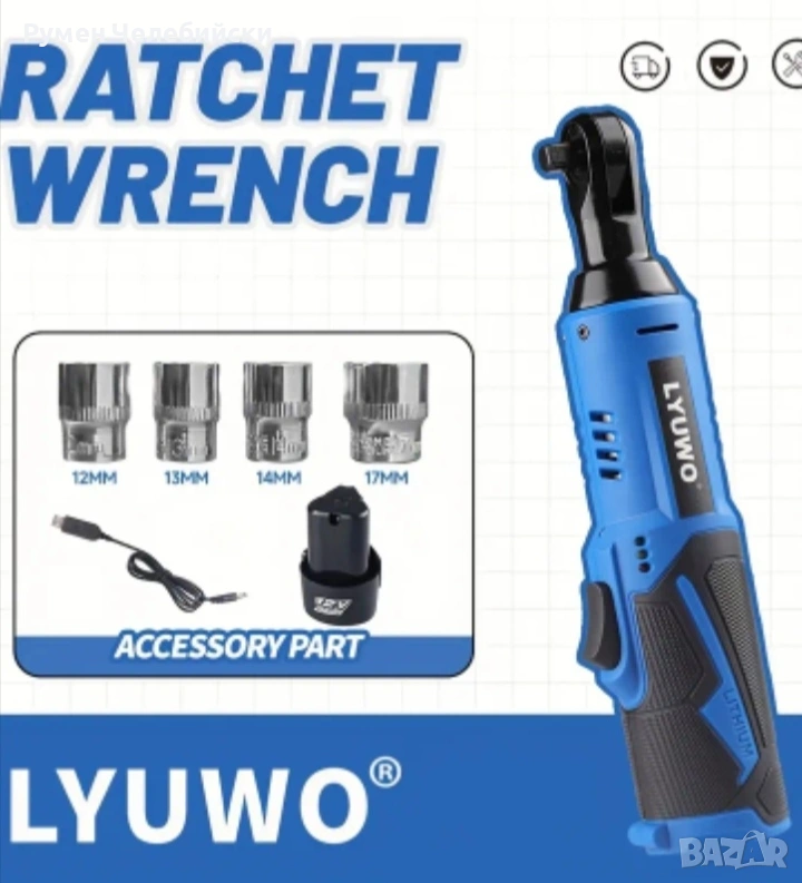 Акумулаторна Тресчотка 3/8 с 1 батерия Описание: -45 Nm система с голям въртящ момент, висока скорост, силна мощност и ефективна защита срещу повреда на машината, причинена от прекомерна температура на двигателя -3/8'' квадратна глава, шпиндел от манганова стомана са захванати прецизно и втулката може да се отстрани без необходимостта от премахването му - Положителен и отрицателен R/F дизайн, лесен за разглобяване - 2 Литиеви батерии с голям капацитет, лесно зареждане и дълъг живот - Дизайн на LED работна светлина: LED работната светлина автоматично светва по време на работа, което улеснява работата на тъмно - Широка гама от приложения: ремонт на автомобили, механична поддръжка Спецификации: -Тип: Гаечен ключ под прав ъгъл-Подтип: Ключ с тресчотка-Напрежение: 12V-Цвят: Син-Тегло: 1,55 кг-Скорост на празен ход: 2300rpm-Тип батерия Литиево-йонни (Li-ion)-"Размер на главата: 3/8" (10mm)"-Ъгъл: 90o-Размер: 28*5cm 4-комплект фасунги: 12,13,14,17мм Артикулът се предлага с 1 акумулаторна батерия 1500mAh и 1 зарядно ***Цената е за 1 бр. с включен ДДС Всички продукти които предлагаме са нови