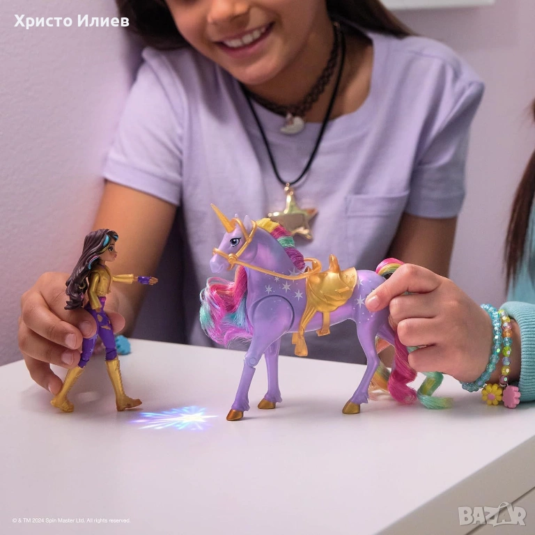 Вдъхновени от анимационния сериал на Netflix, от Spin Master създават този приказен комплект. С реалистичните си детайли и меката грива и опашка, еднорогът е повече от впечатляващ, а за максимално реалистична игра той е със светлинни ефекти и звукови ефекти. Куклата е със 7 точки на артикулация и може да бъде поставена върху еднорога.