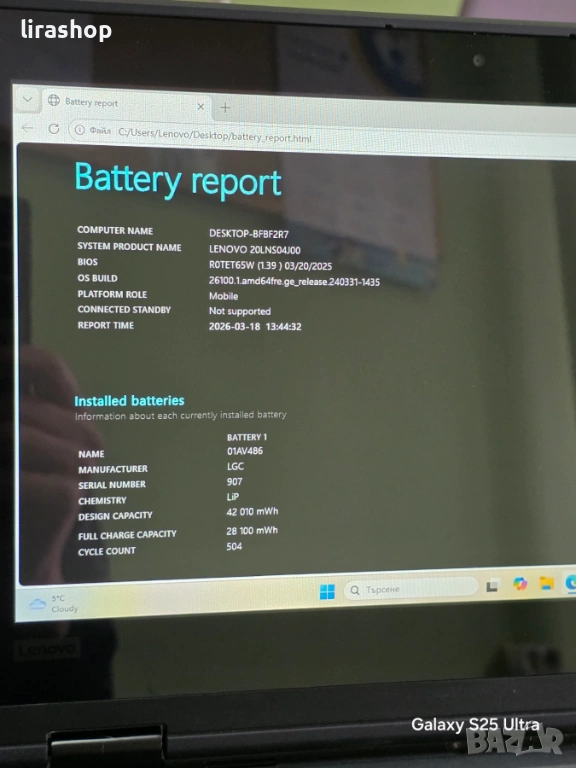 Батерията издържа над 4 часа, в комплект със оригинално зарядно. Инсталиран с windows 11 Pro x64 и всички необходими програми, готов за ползване.