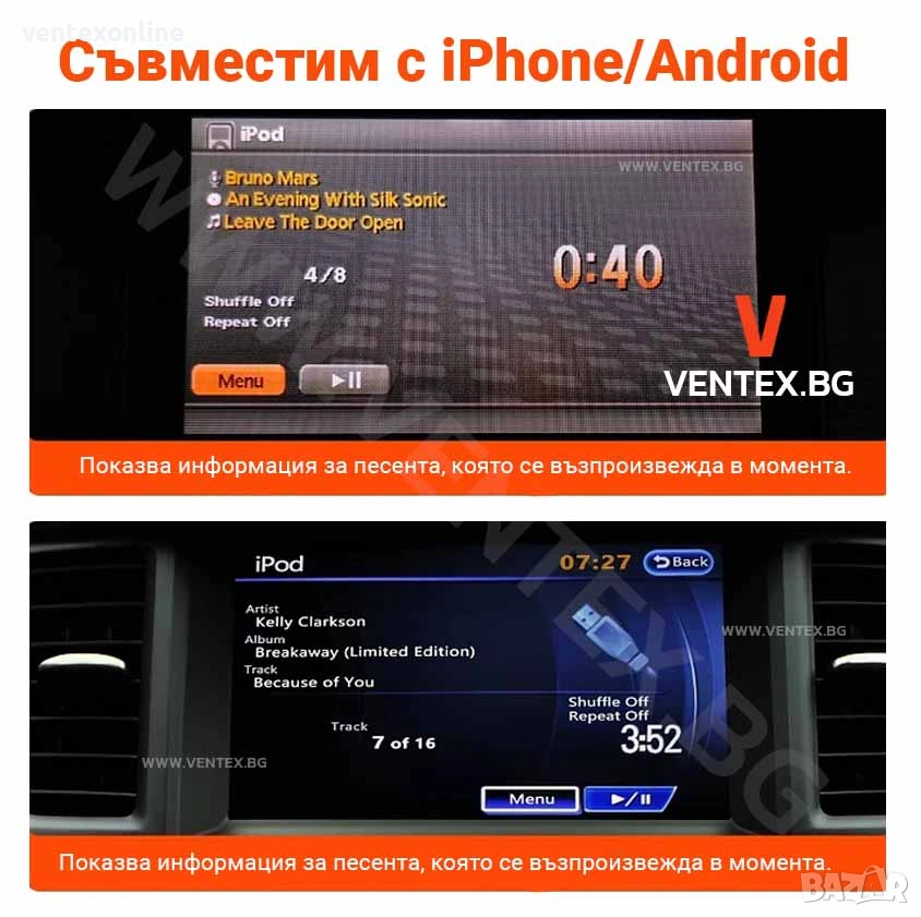 На екрана на автомобила се визуализира текущата песен (заглавие / изпълнител / трак).