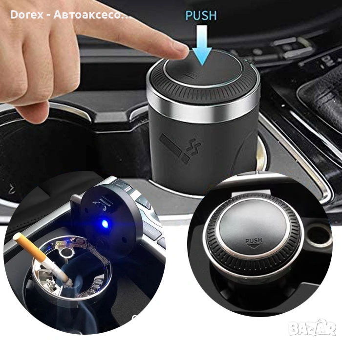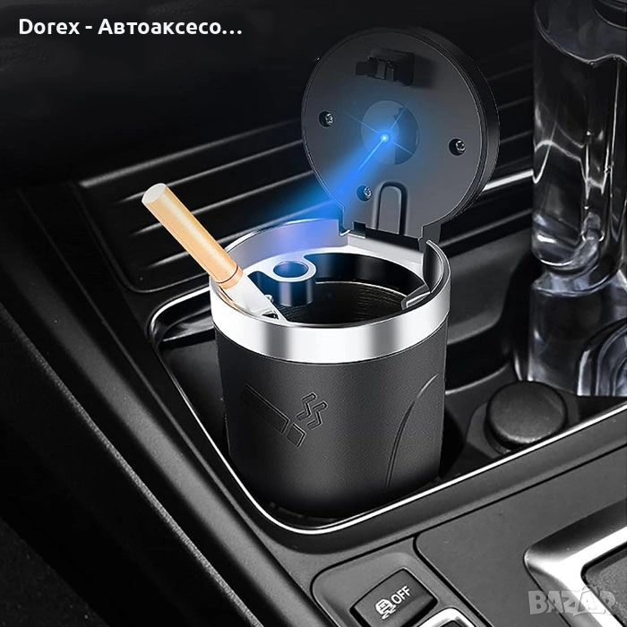 Компактен автомобилен пепелник с вграден син LED диод, осигуряващ удобство при използване през нощта. Стилен и практичен аксесоар за всеки автомобил.