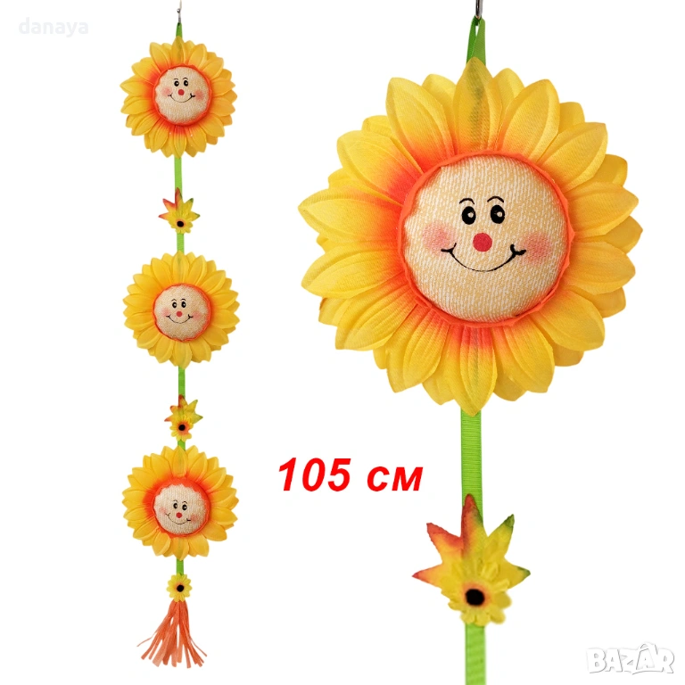 С дължина 105 см, тази великденска украса е идеална за врата, стена или прозорец. Ярките слънчогледи с усмихнати лица придават настроение и превръщат пространството в по-цветно и приветливо. Подходяща е както за великденска декорация, така и за цялостна пролетна украса у дома.