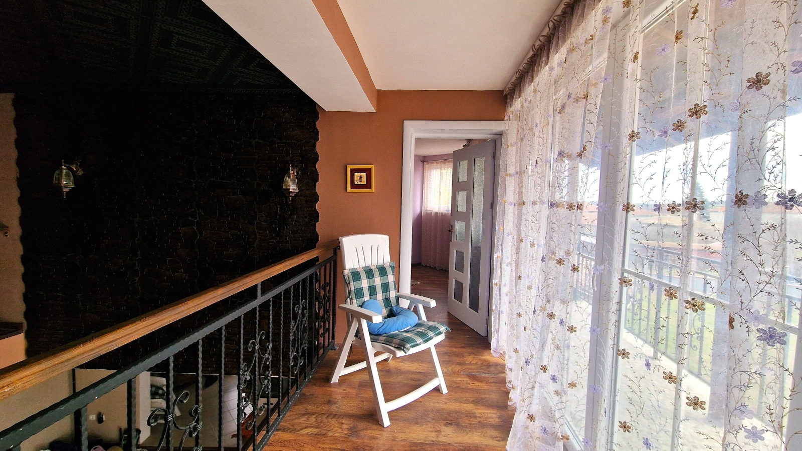 Първи етаж: входно антре, просторна дневна с камина, трапезария, кухненски бокс, две спални, баня и отделна тоалетна. Пространството е функционално разпределено, с удобен достъп до двора. Втори етаж: две спални, като едната лесно може да бъде обособена като гардеробна, баня с тоалетна и тераса гледка към двора.